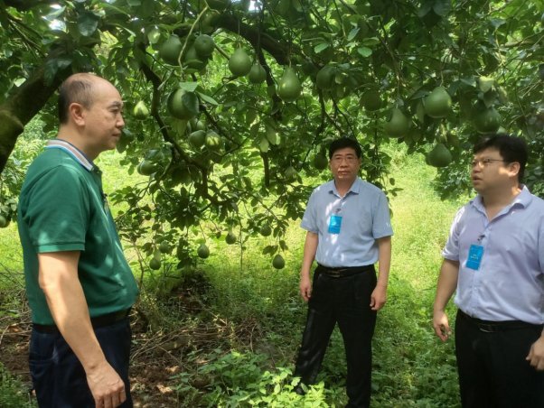 图为在糯米柚生产基地调研,听取融储金钱果业公司负责人介绍情况。
