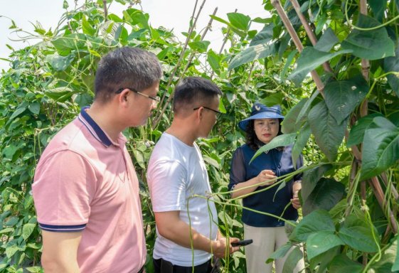 图一:秦雪梅在和睦村柳州螺蛳粉原材料(豆角)基地调研。
