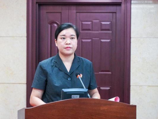 图为自治县人民法院副院长周香就自治县人民法院提请的人事任免事项作说明。