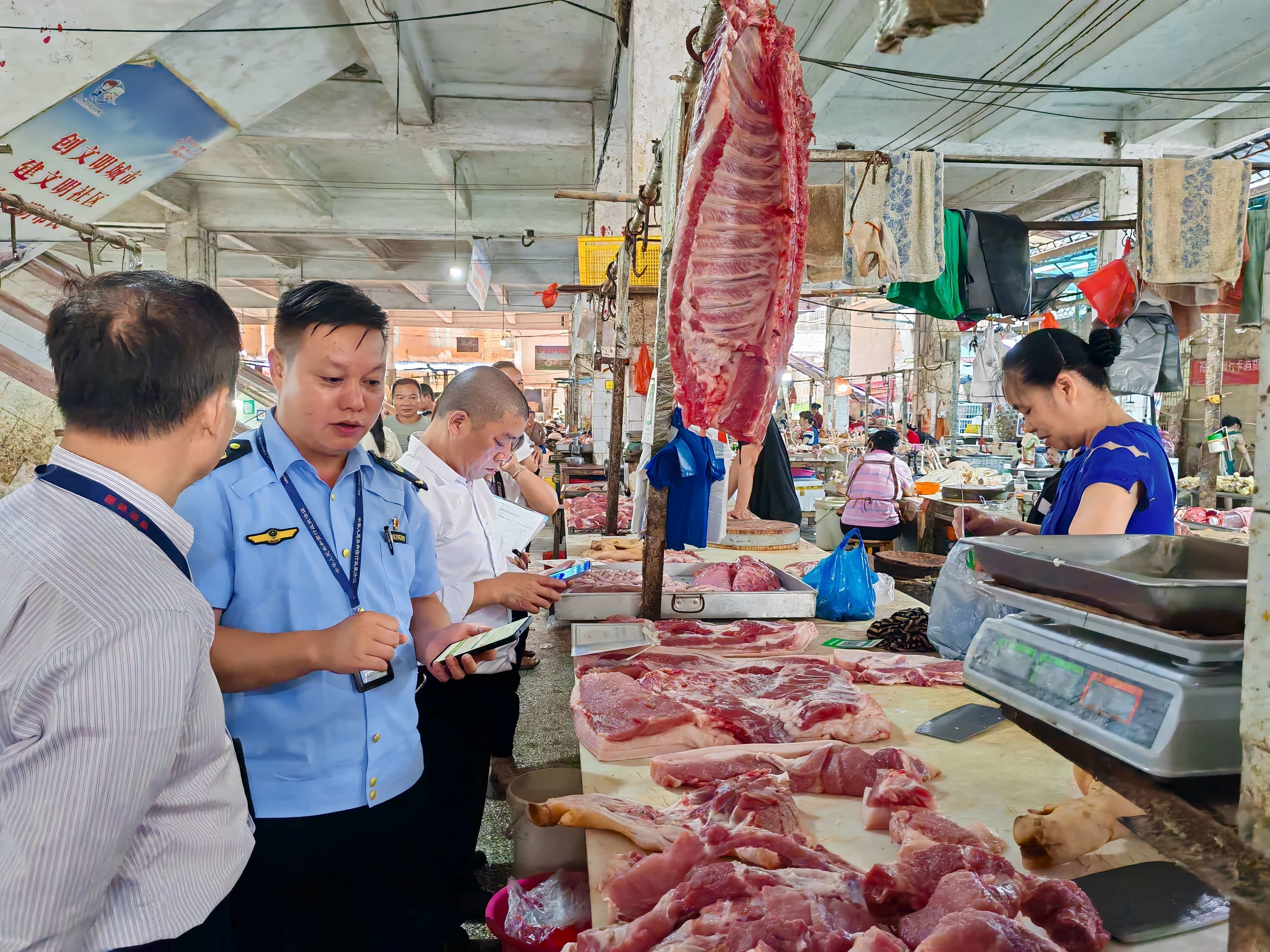 在民族市场肉类制品专区,检查小组将监管重心放在肉类质量安全“生命线”上。每到一个摊位,工作人员均仔细核对猪肉“两证一报告”(动物检疫合格证明、肉品品质检验合格证明、非洲猪瘟检测报告),认真检查肉类是否加盖合格印章、是否规范公示溯源码,坚决杜绝未经检疫、检疫不合格或来源不明的肉类流入消费市场,守护群众“餐桌上的安全”。