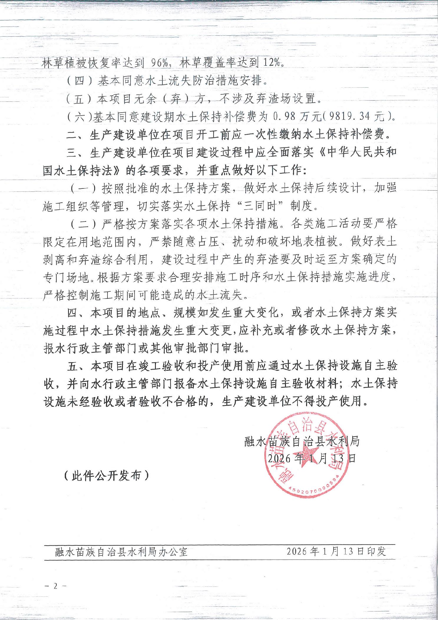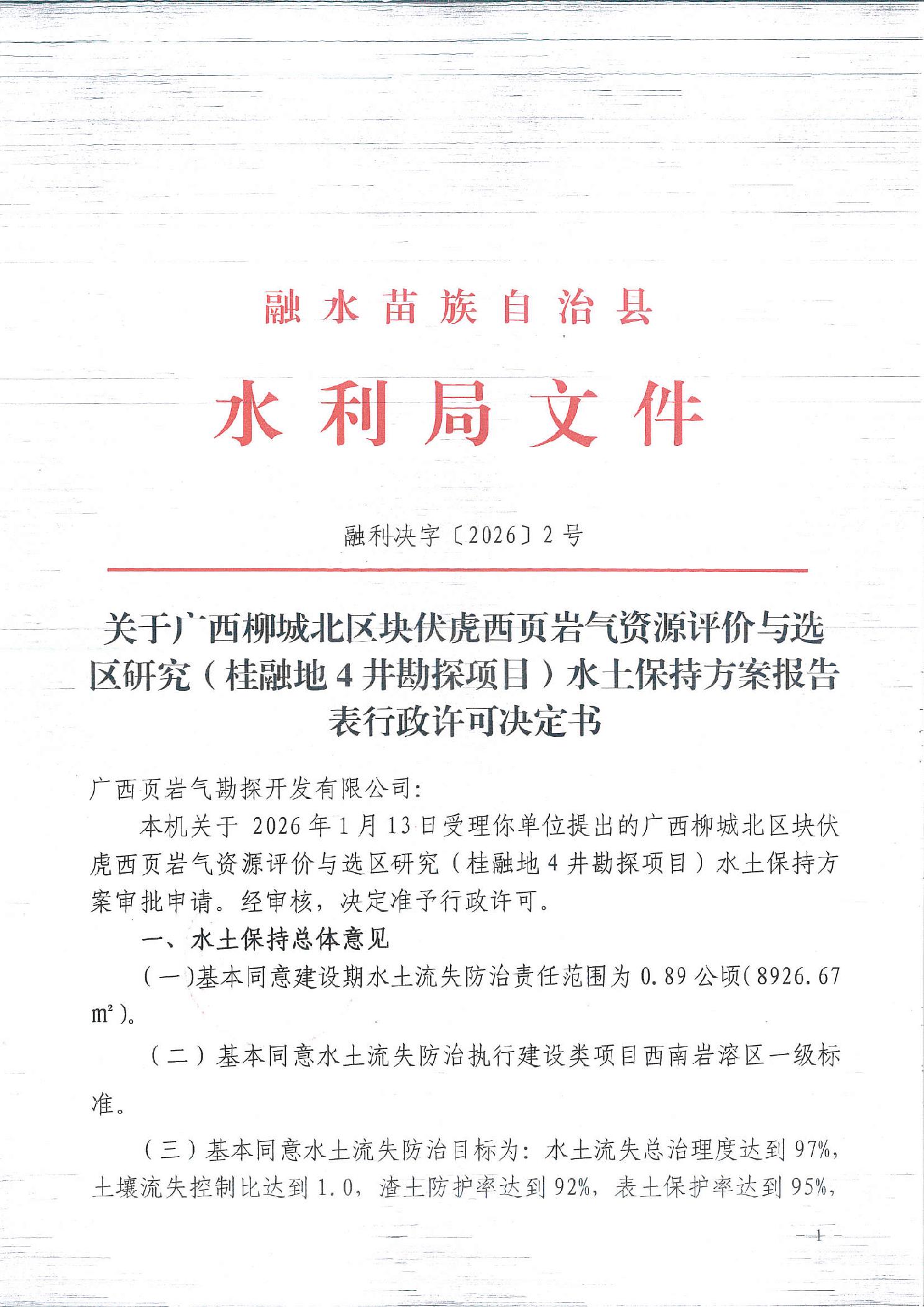 (融利决字〔2026〕2号)关于广西柳城北区块伏虎西页岩气资源评价与选区研究(桂融地4井勘探项目)水土保持方案报告表行政许可决定书