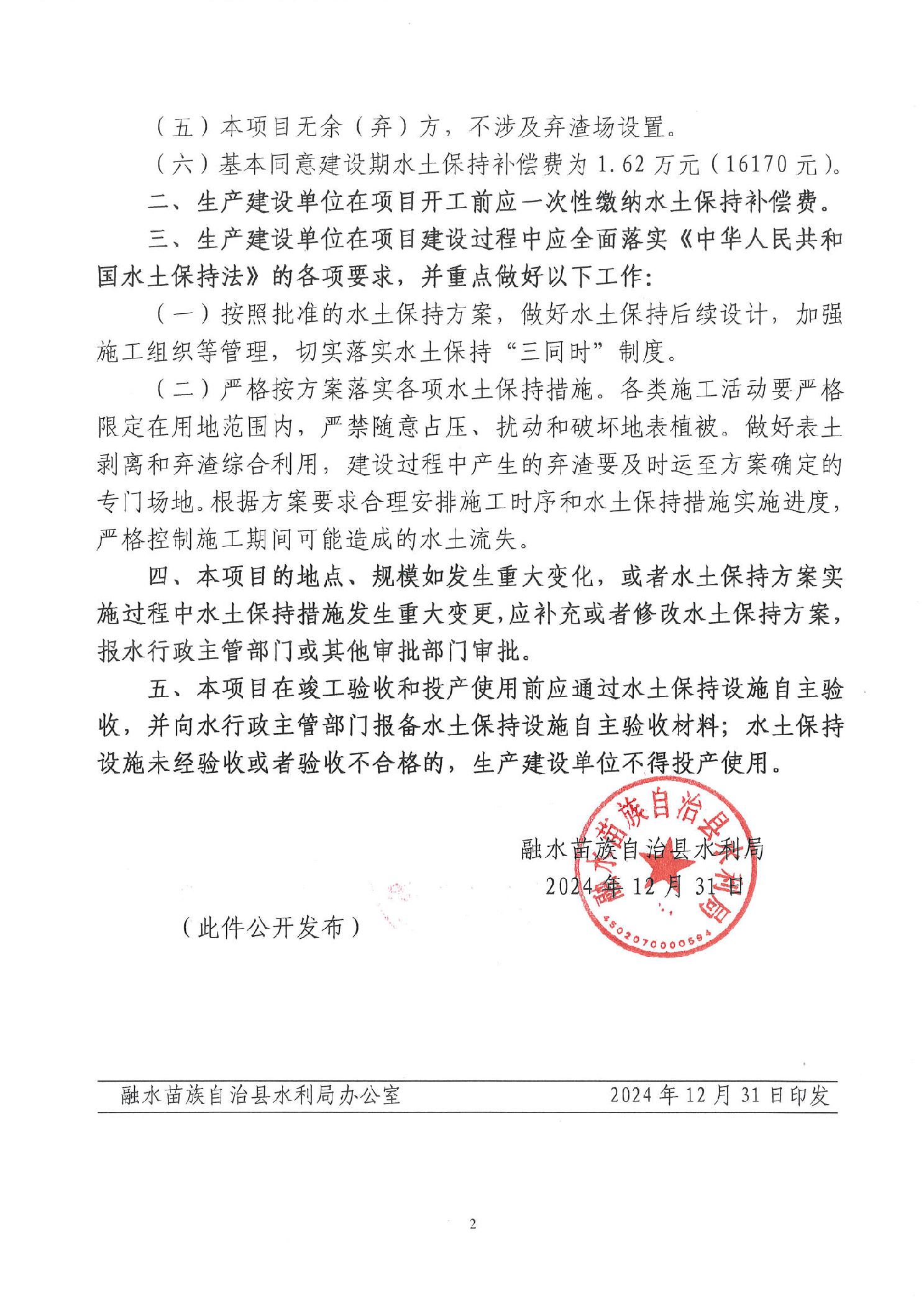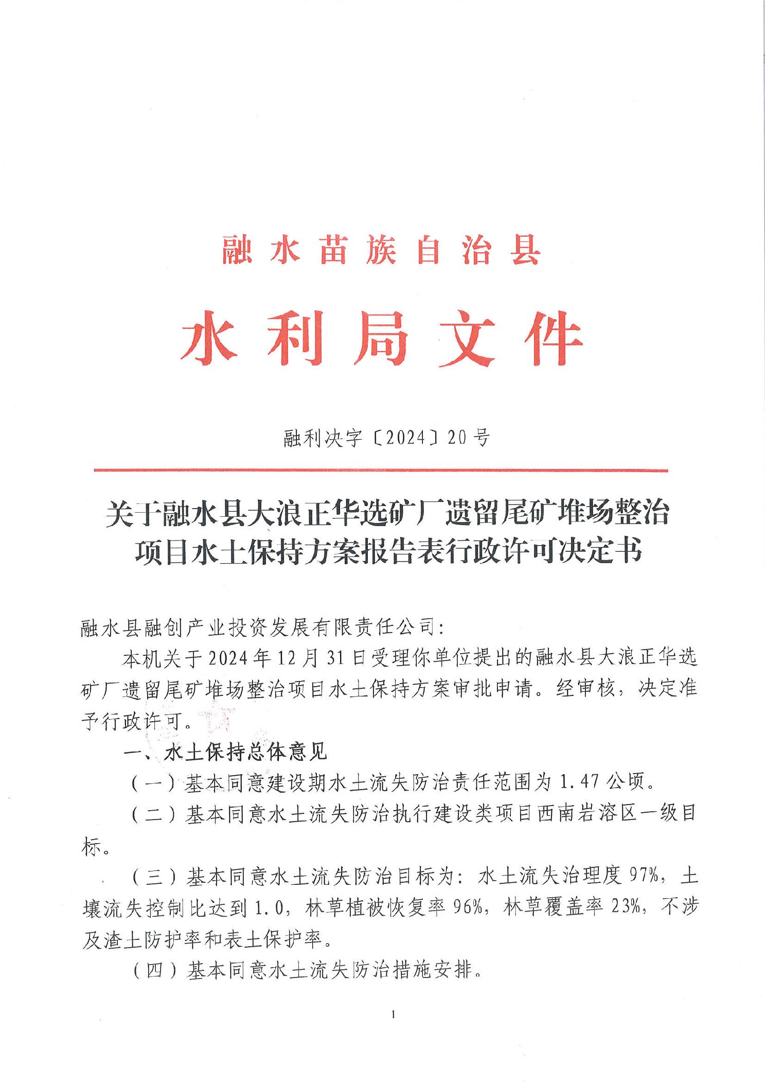 (融利决字〔2024〕20号)融水县大浪正华选矿厂遗留尾矿堆场整治水土保持方案报告表行政许可决定书