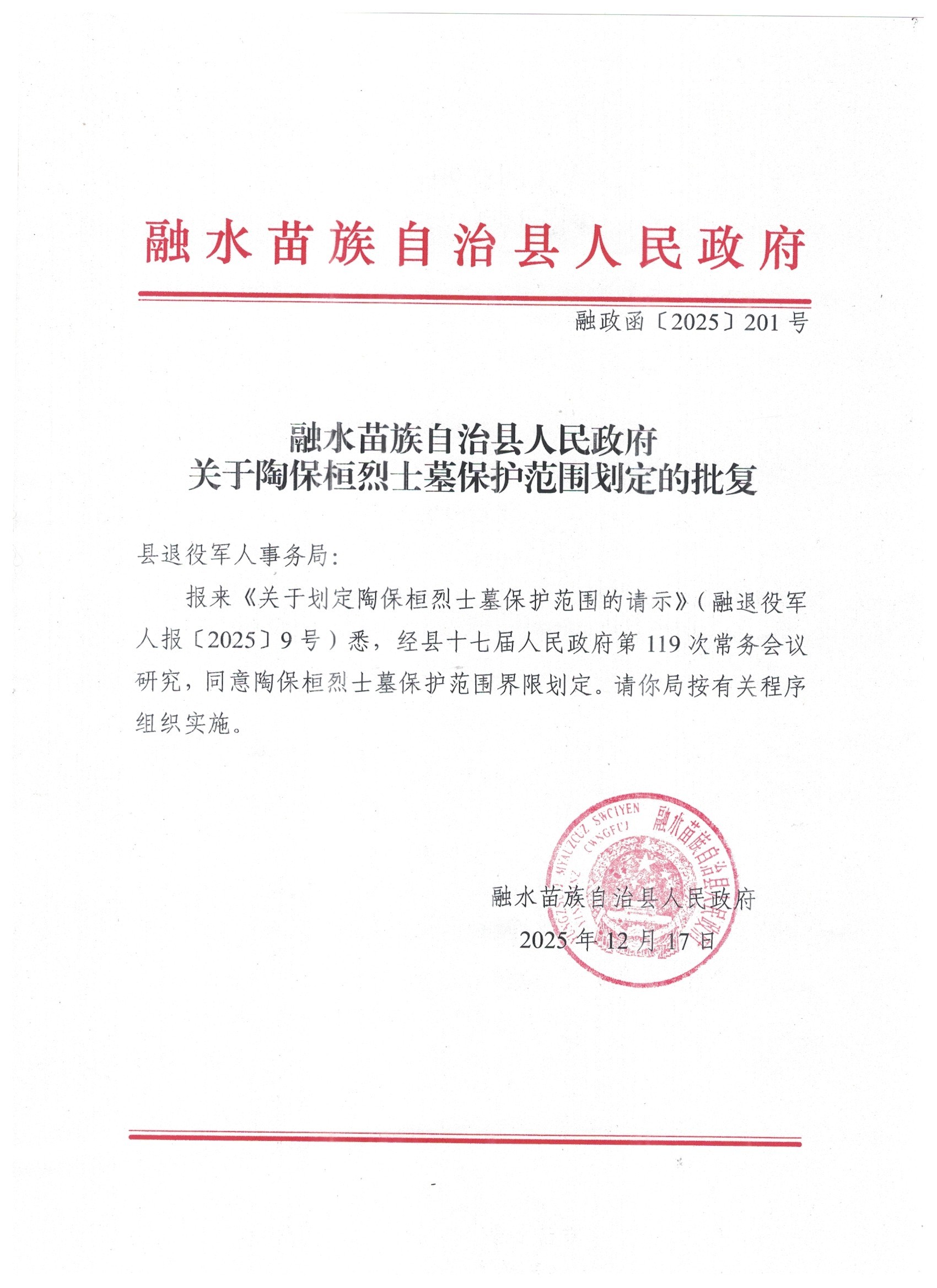 融水苗族自治县人民政府关于陶保桓烈士墓保护范围划定的批复
