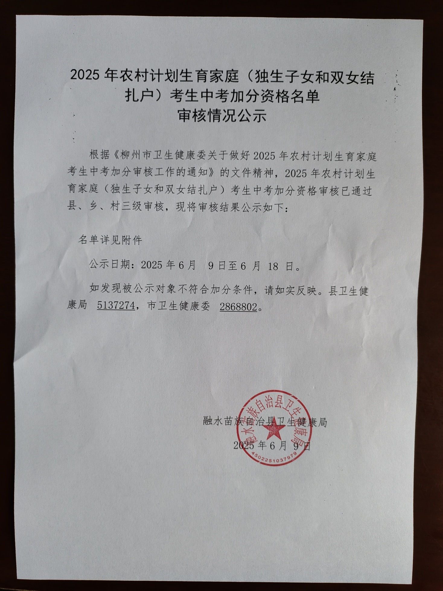 2025年农村计划生育家庭(独生子女和双女结扎户)考生中考加分资格名单审核情况公示