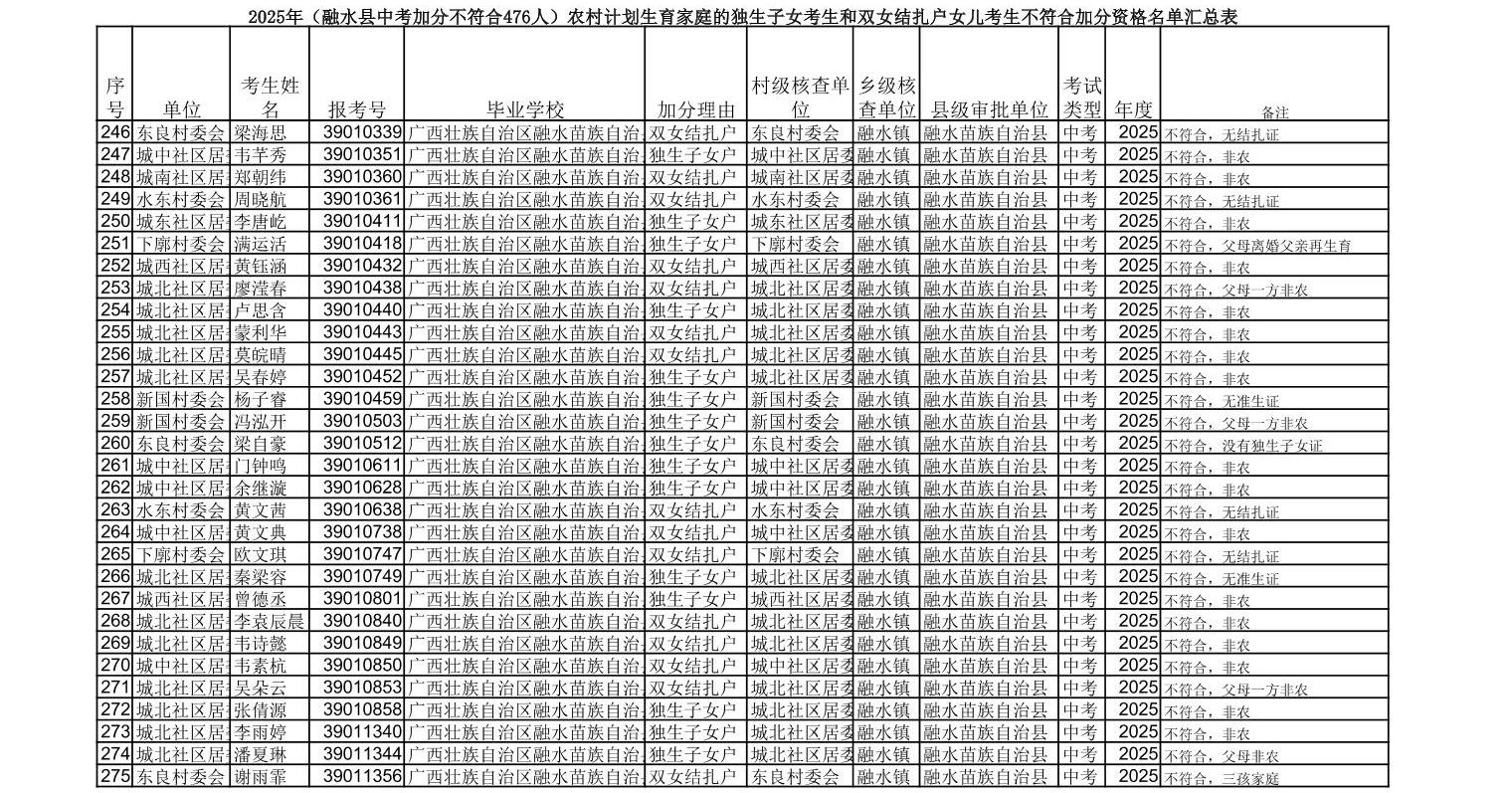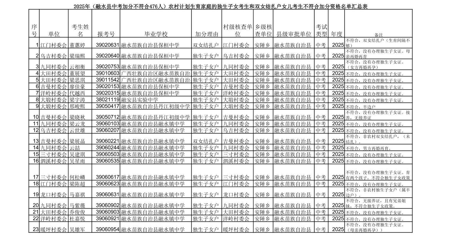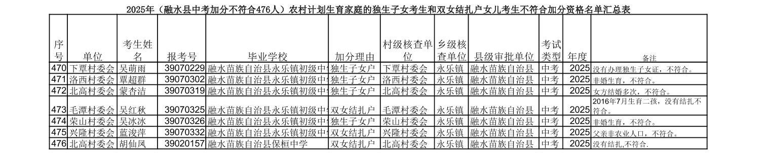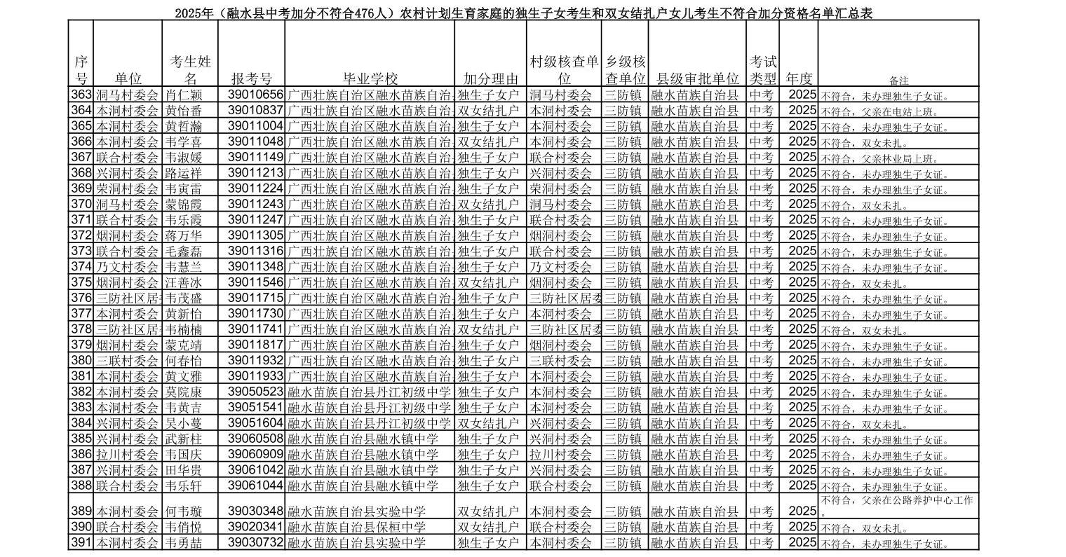 ▼2025年(融水县中考加分不符合476人)农村计划生育家庭的独生子女