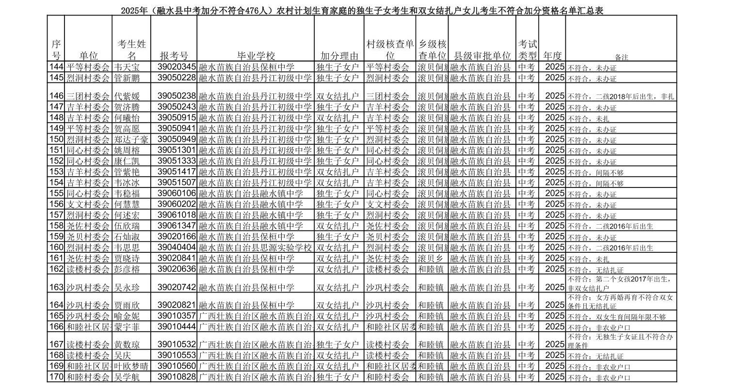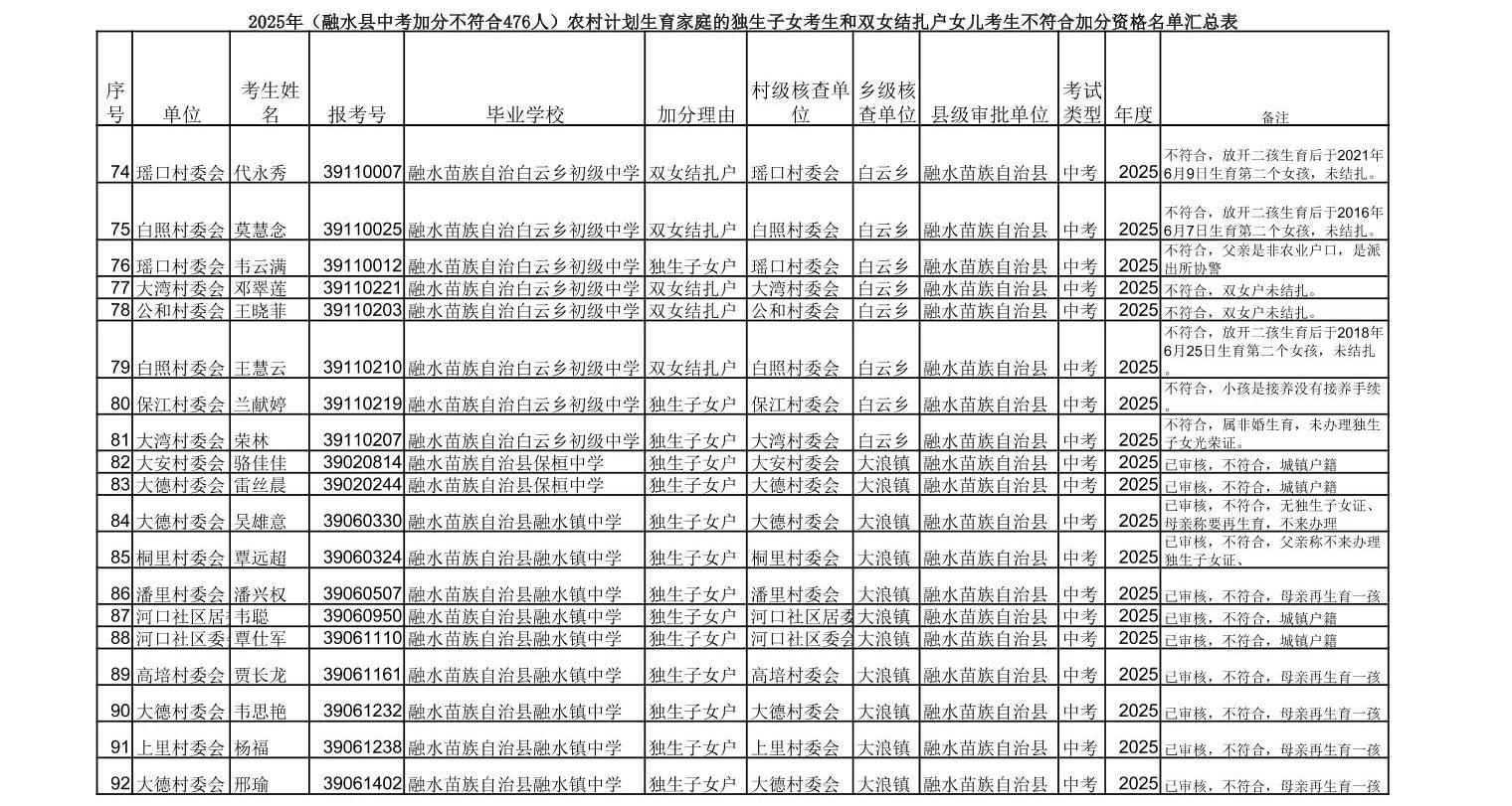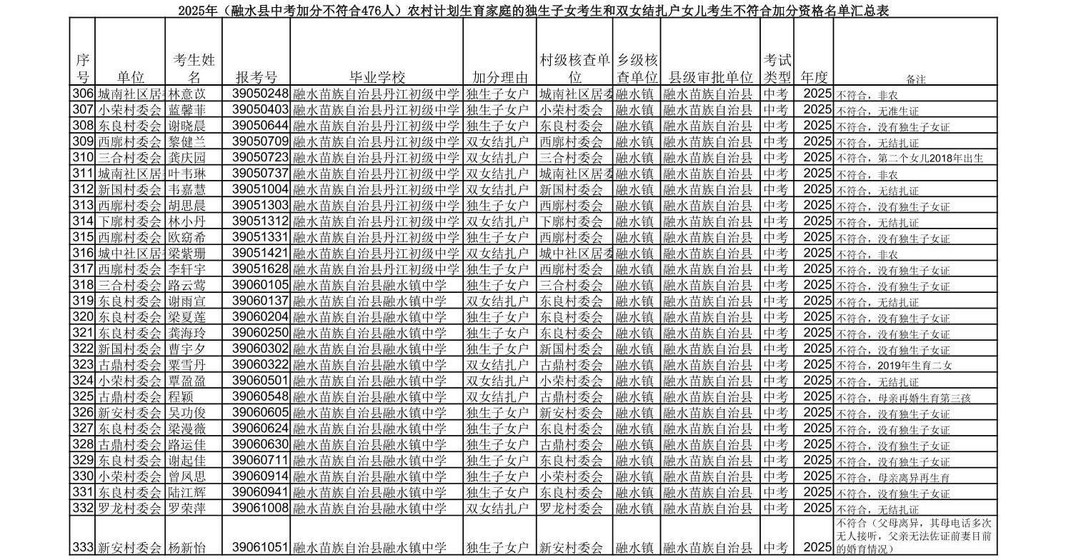 ▼2025年(融水县中考加分不符合476人)农村计划生育家庭的独生子女