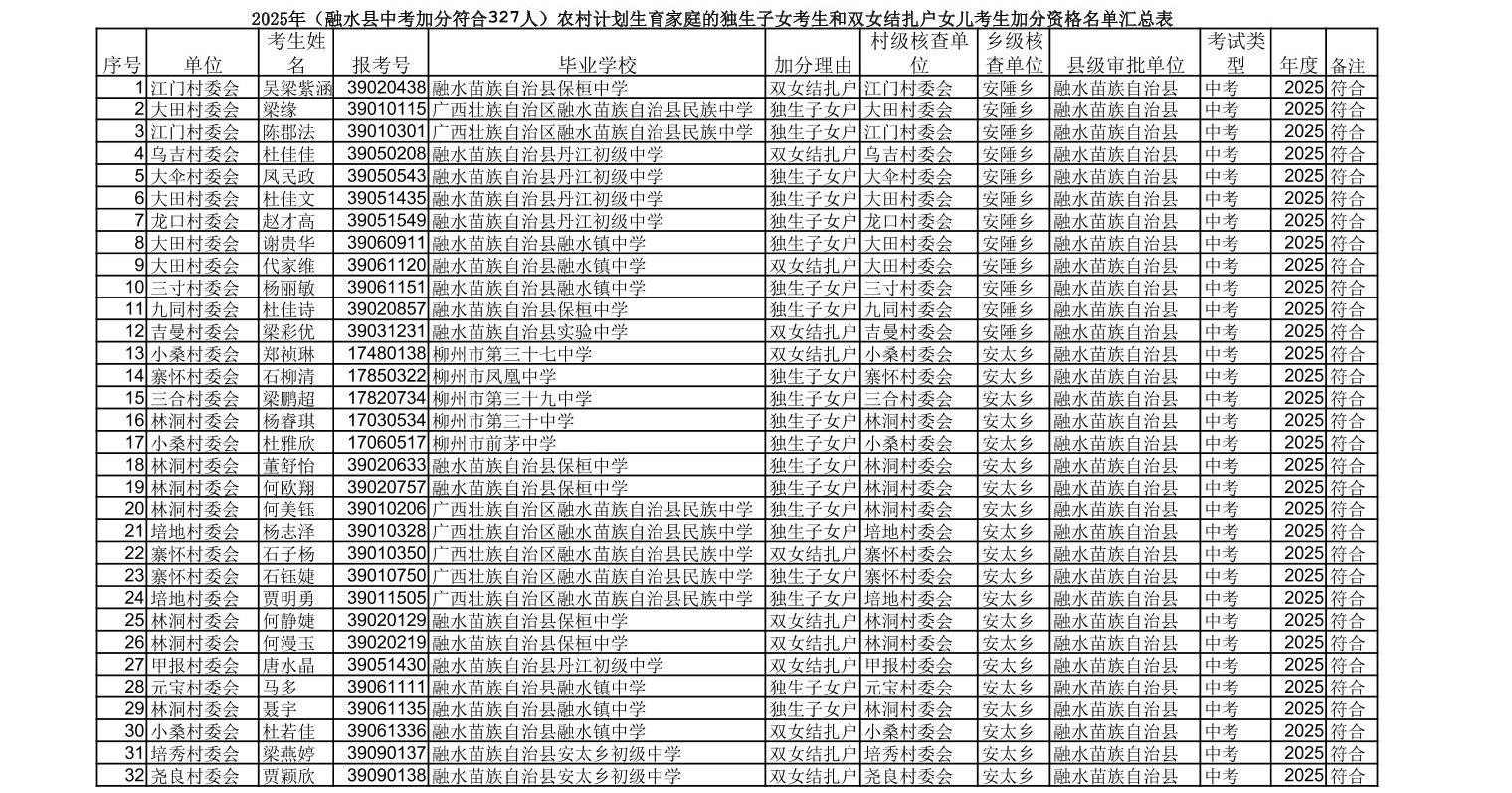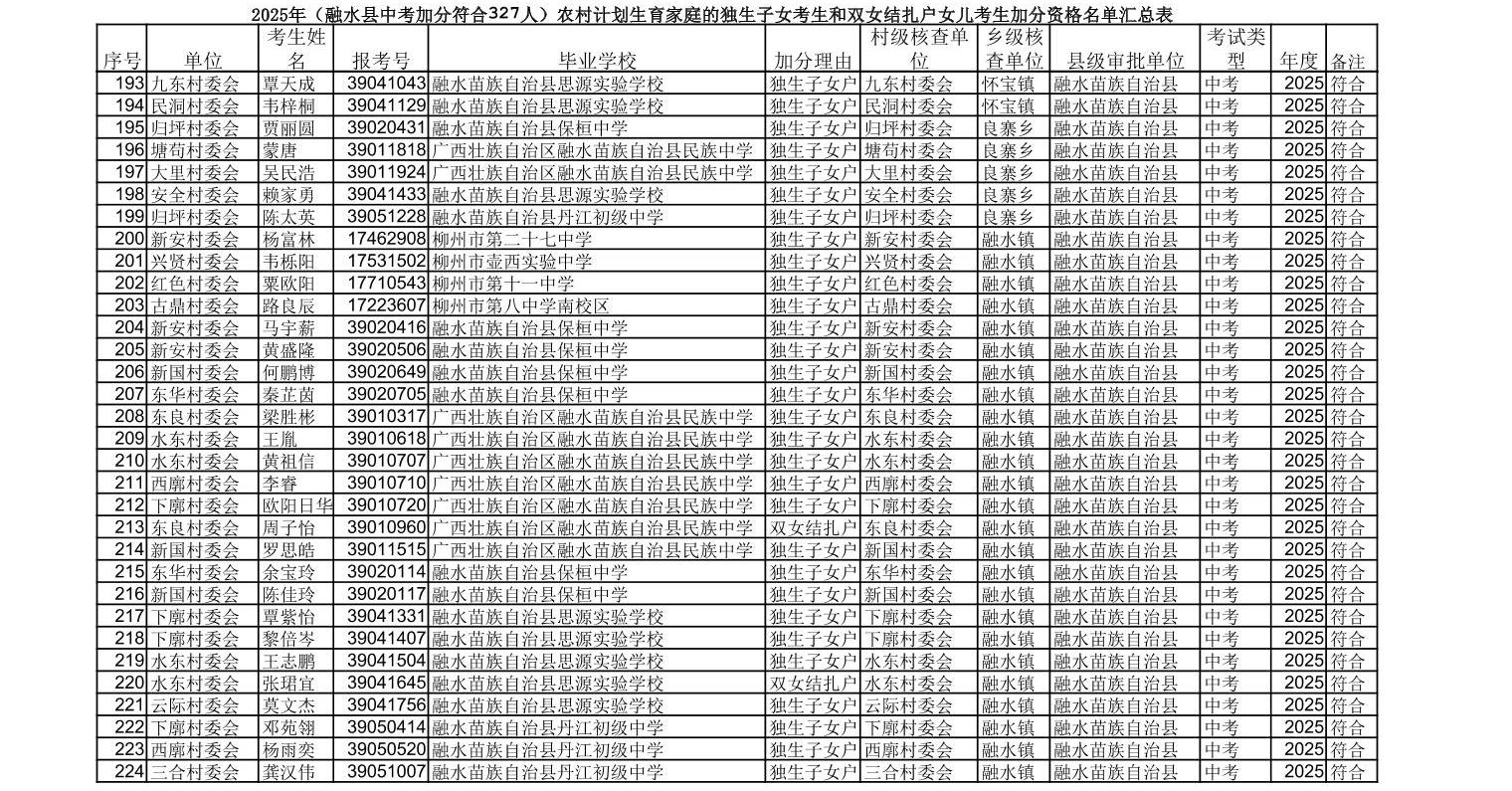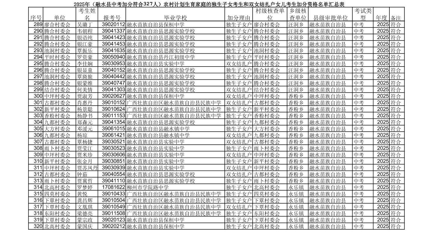▼2025年(融水县中考加分符合327人)农村计划生育家庭的独生子女