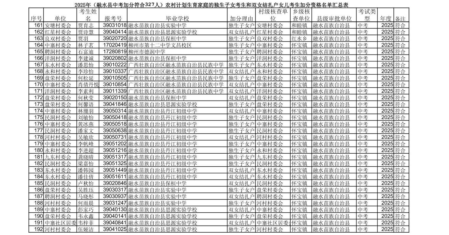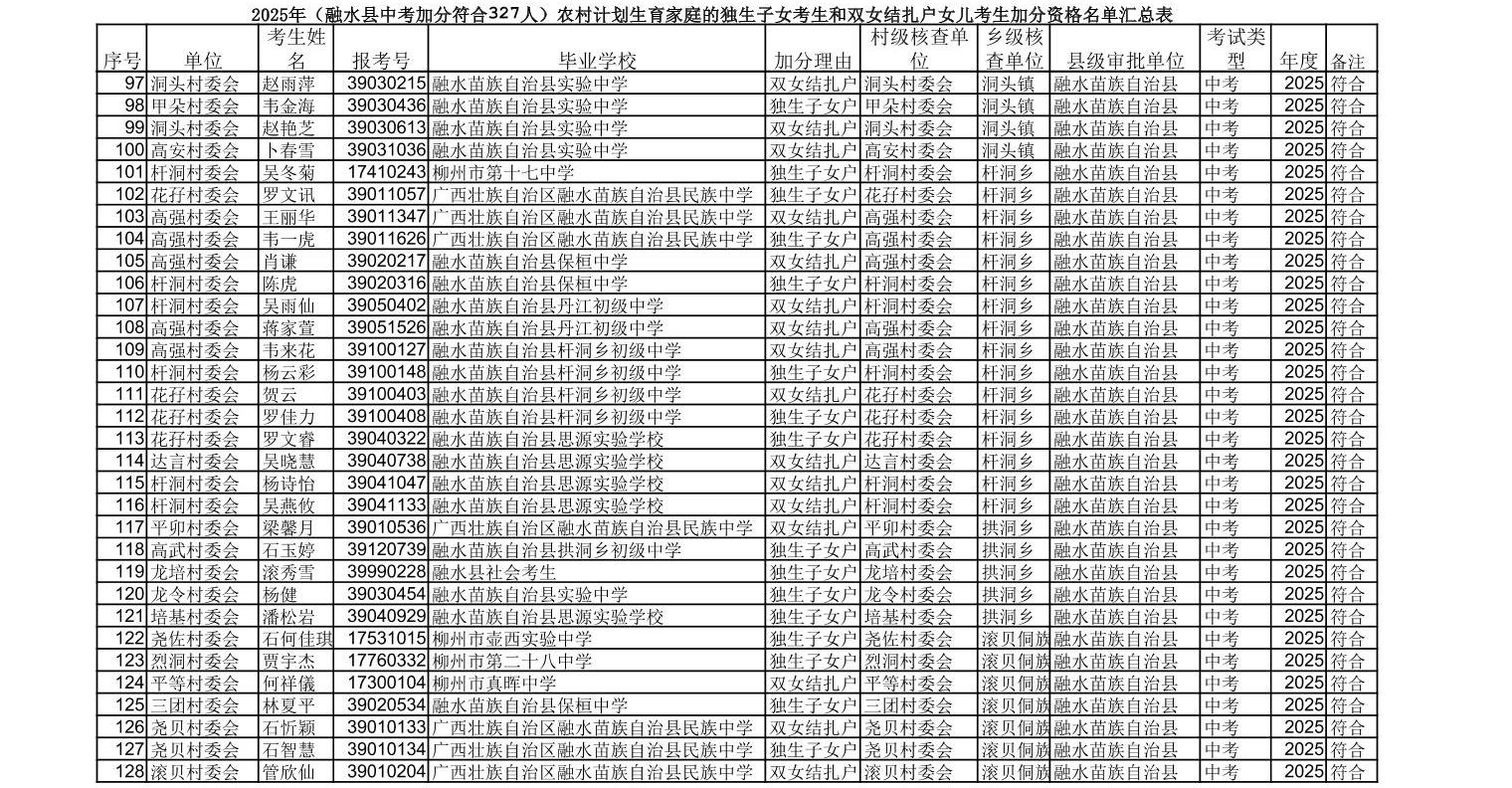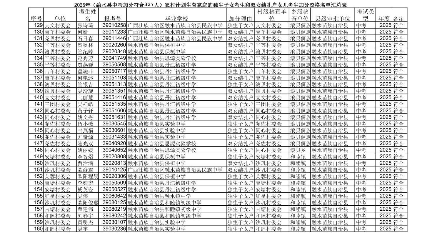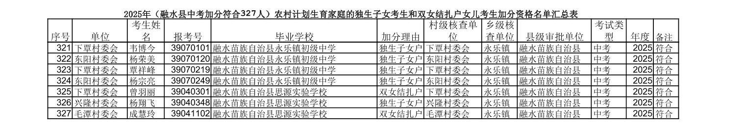 ▼2025年(融水县中考加分符合327人)农村计划生育家庭的独生子女