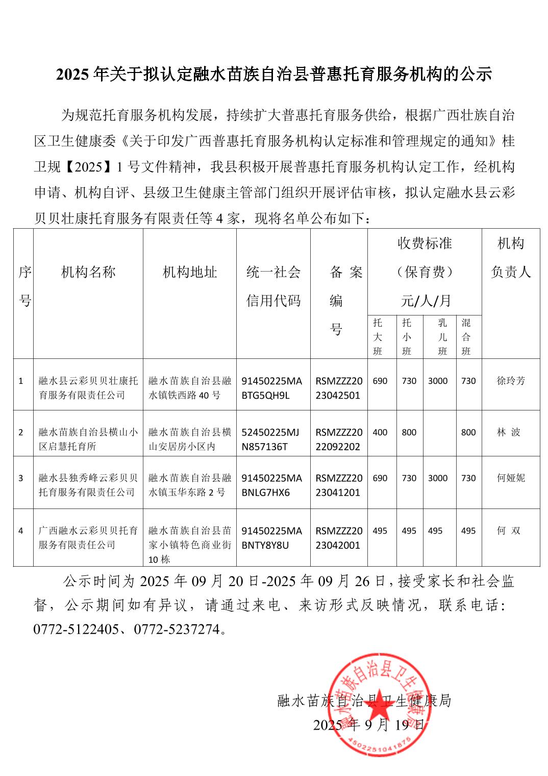 2025年关于拟认定融水苗族自治县普惠托育服务机构的公示