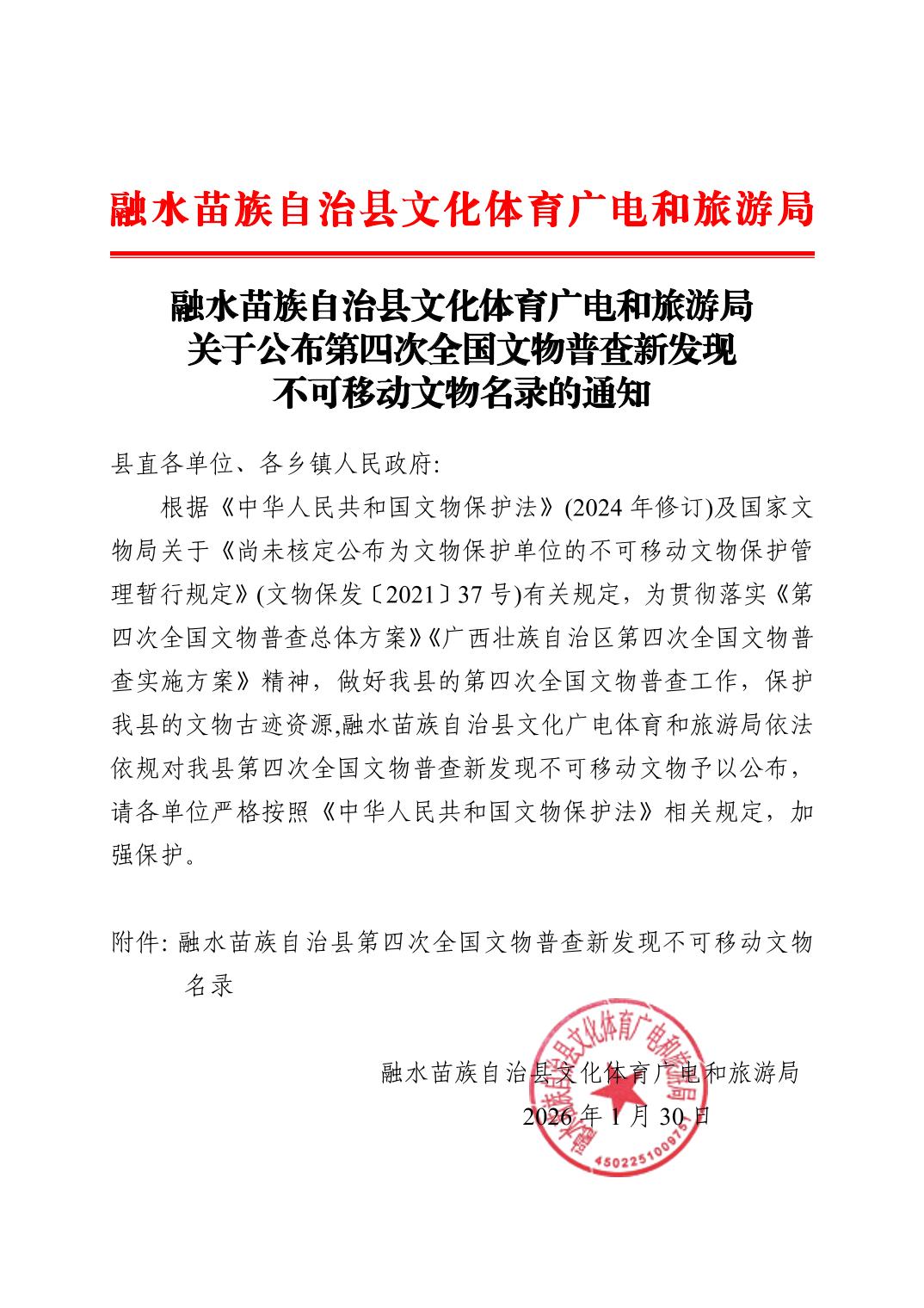 融水苗族自治县文化体育广电和旅游局关于公布第四次全国文物普查新发现不可移动文物名录的通知