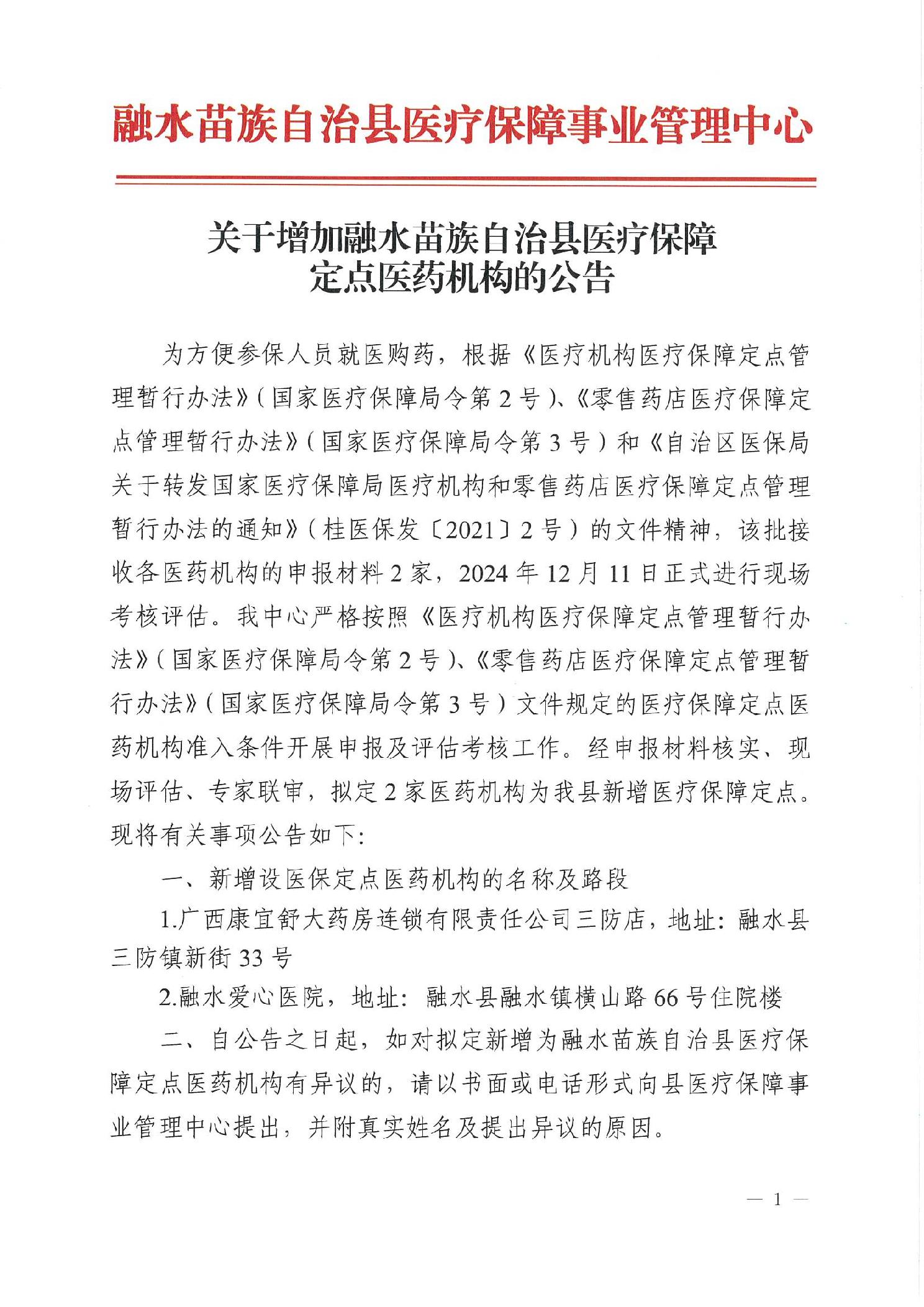 关于增加融水苗族自治县医疗保障定点医药机构的公告
