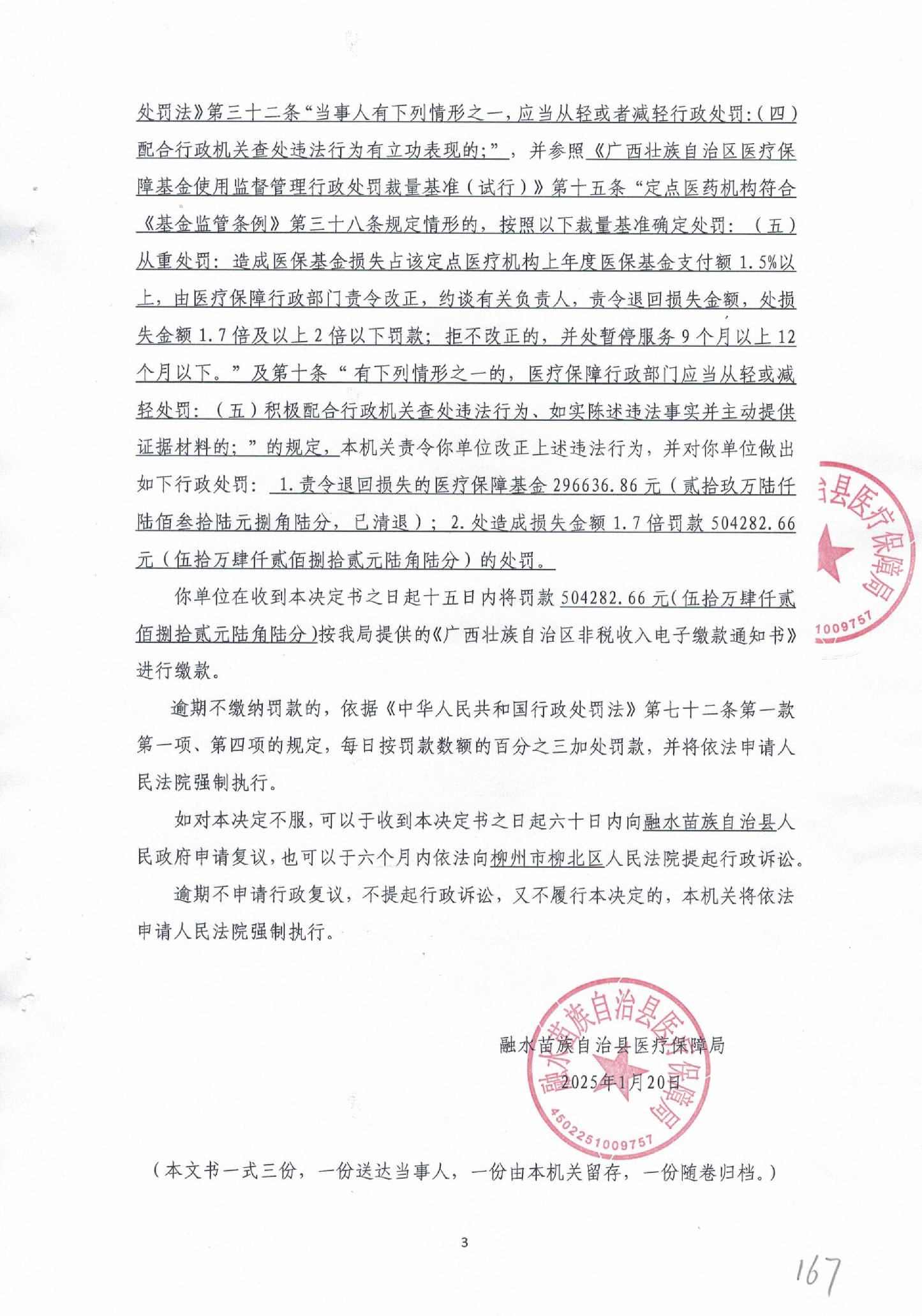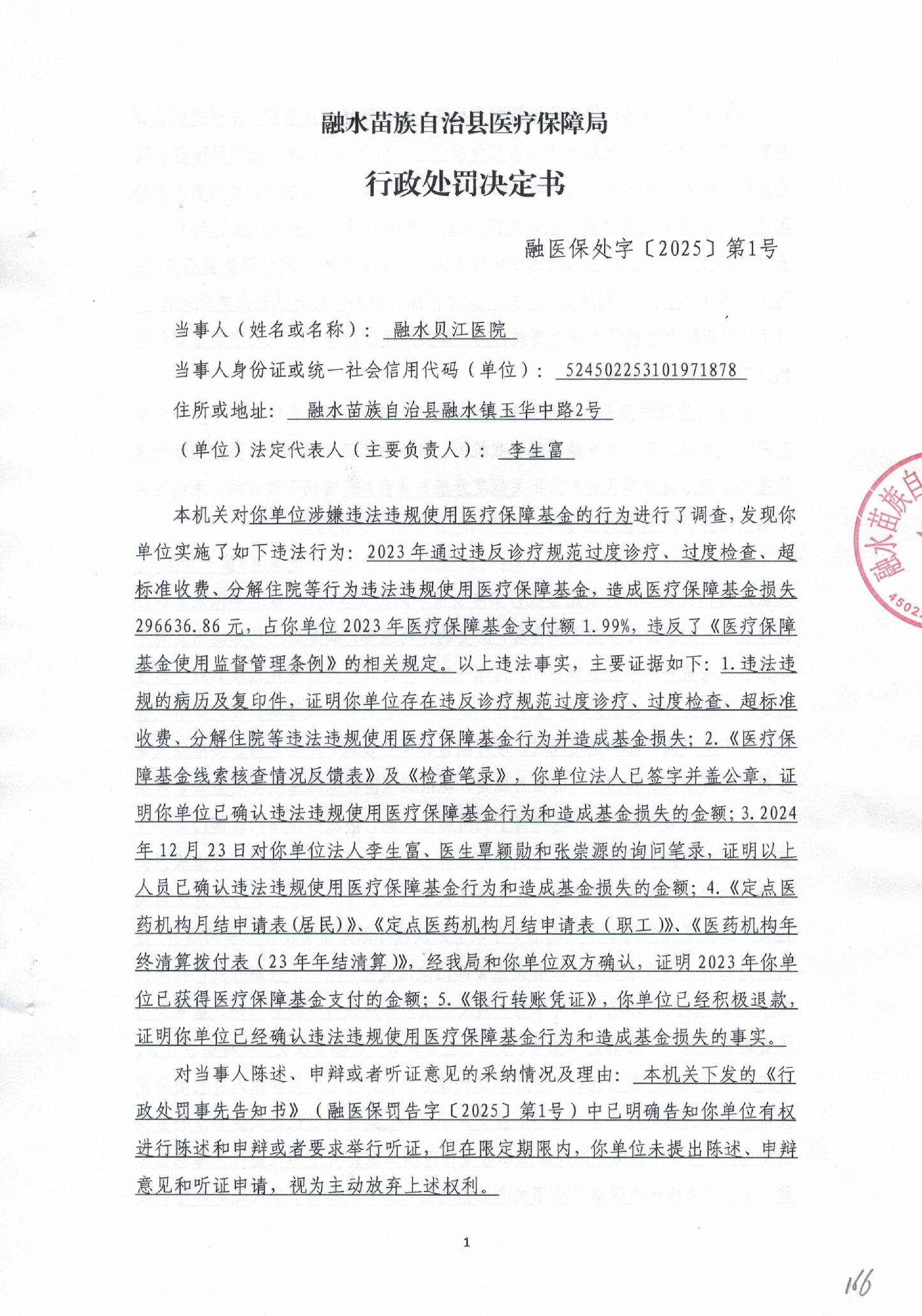 融水苗族自治县医疗保障局行政处罚决定书(融医保处字〔2025〕第1号)
