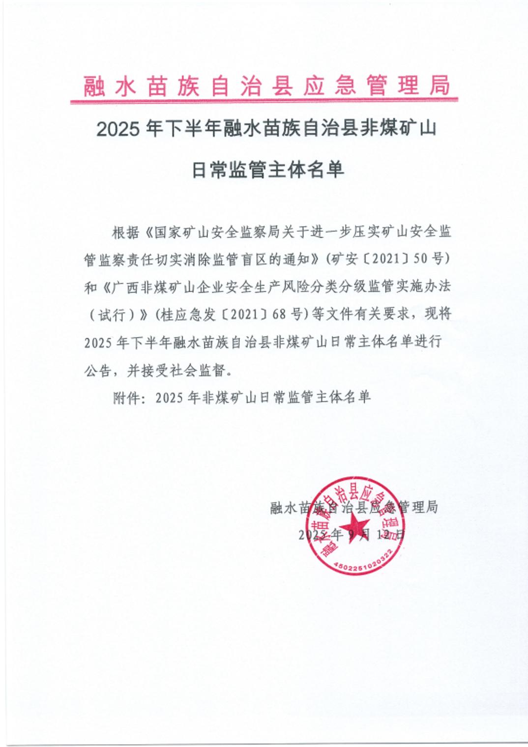 2025年下半年融水苗族自治县非煤矿山日常监管主体名单