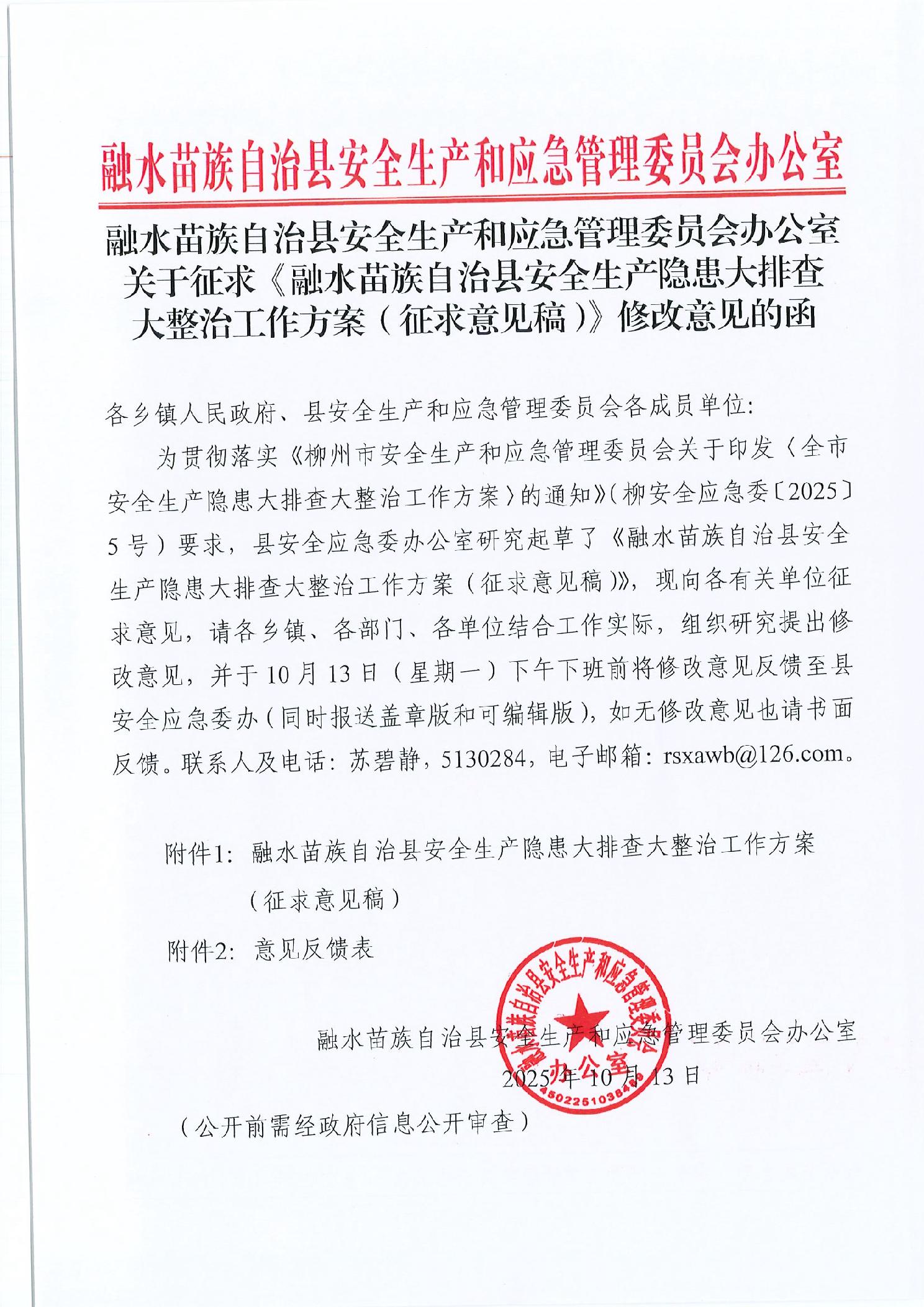 融水苗族自治县安全生产和应急管理委员会办公室关于征求《融水苗族自治县安全生产隐患大排查大整治工作方案(征求意见稿)》修改意见的函