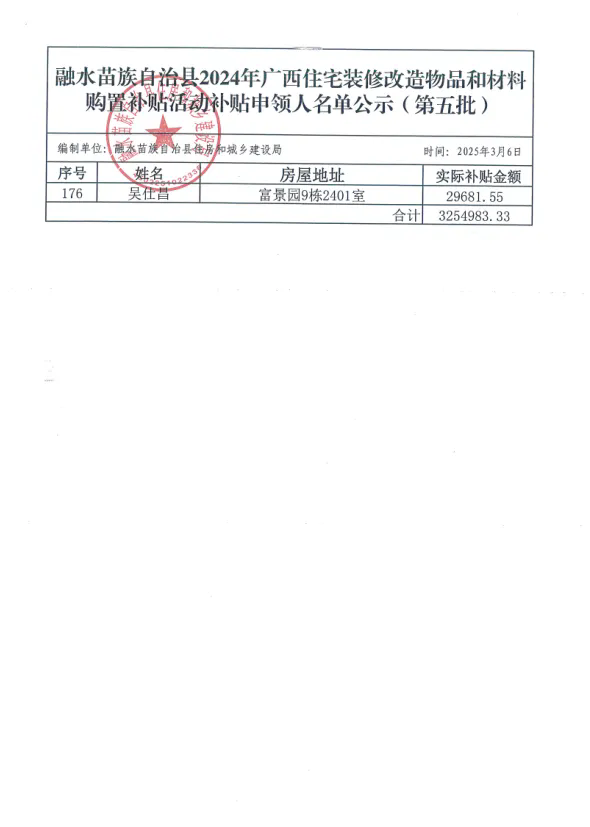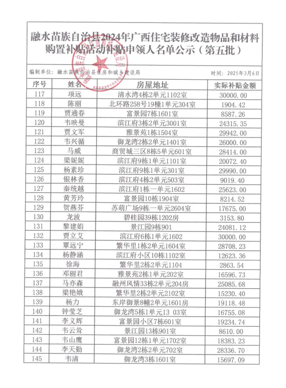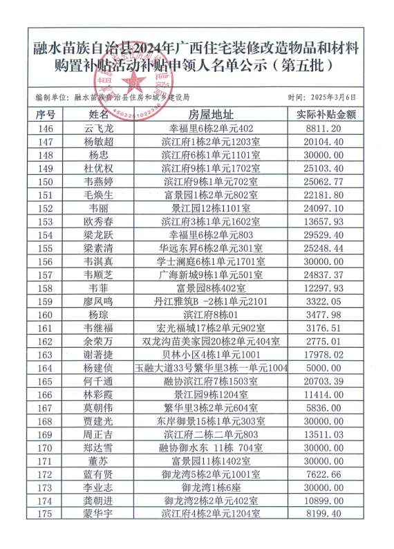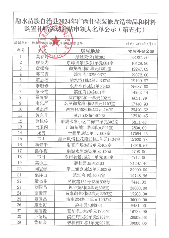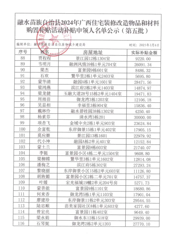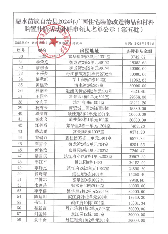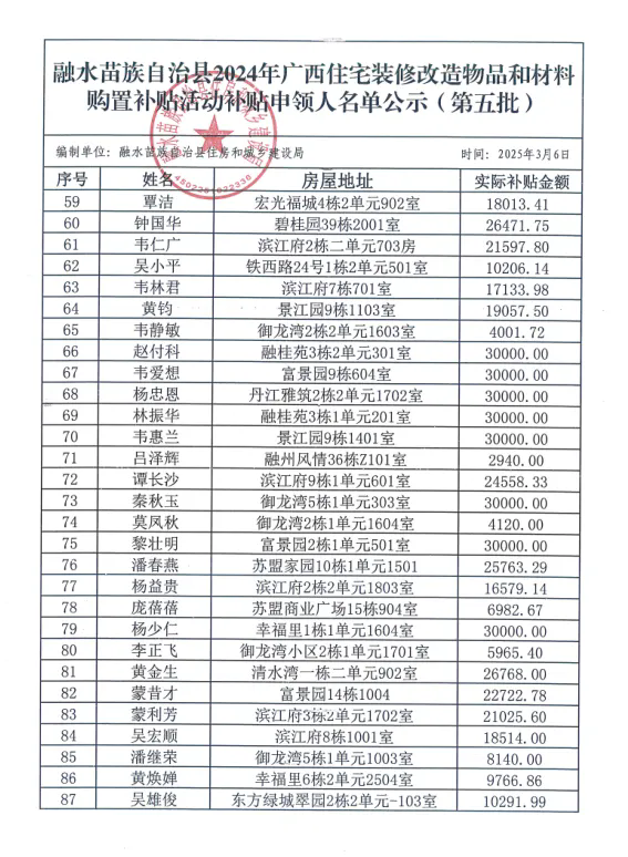 融水苗族自治县2024年广西住宅装修改造物品和材料购置补贴活动补贴申领人名单公示(第五批)