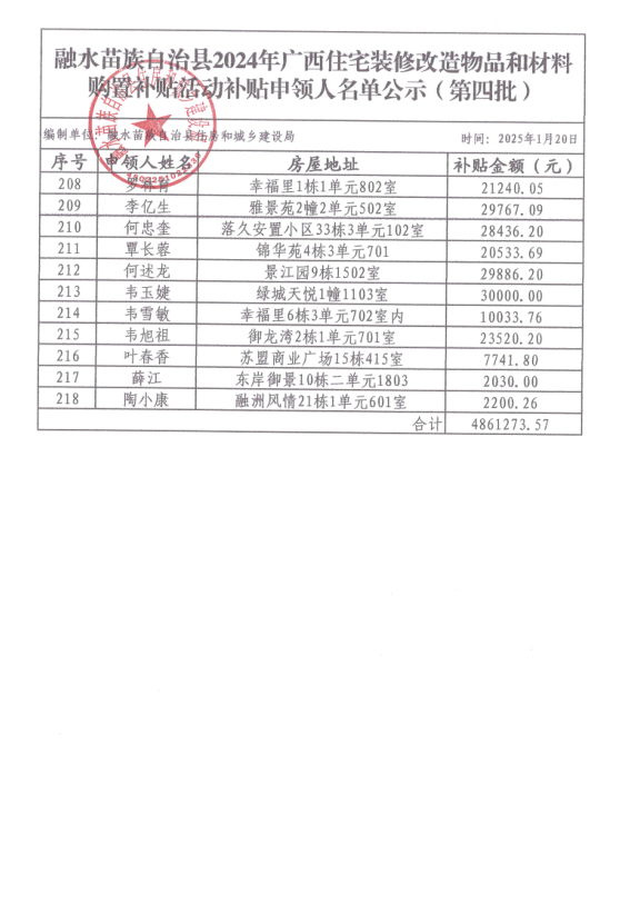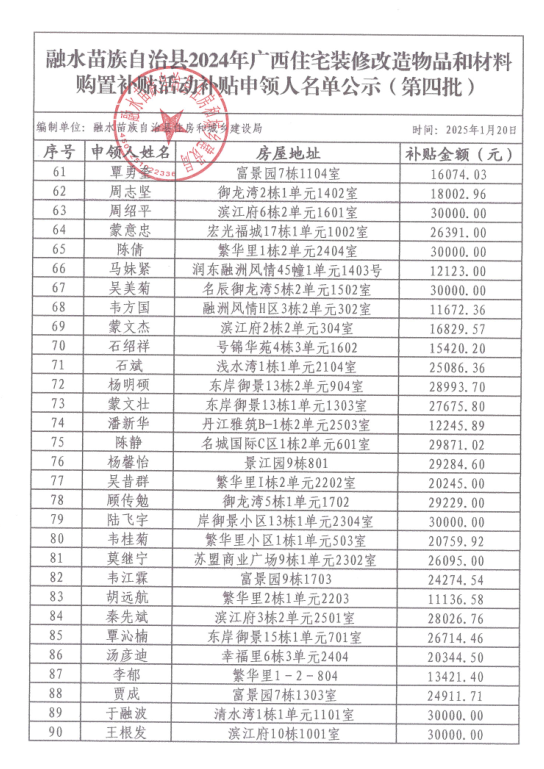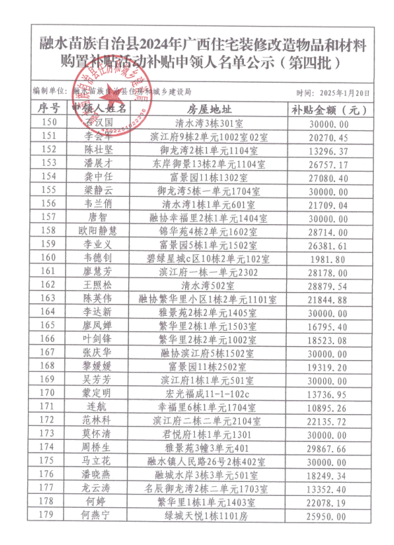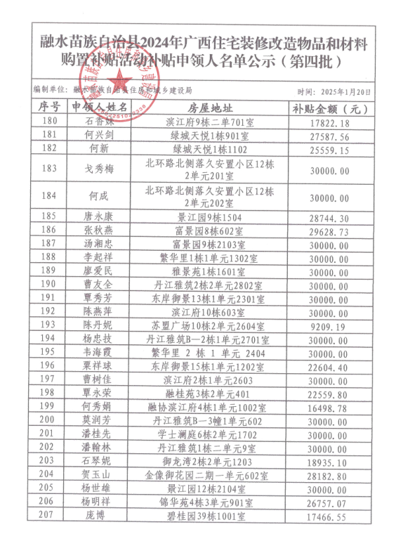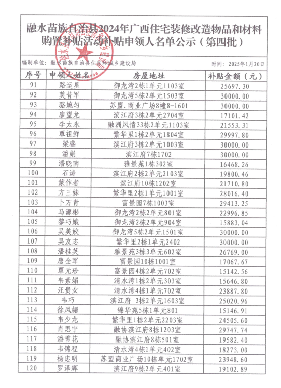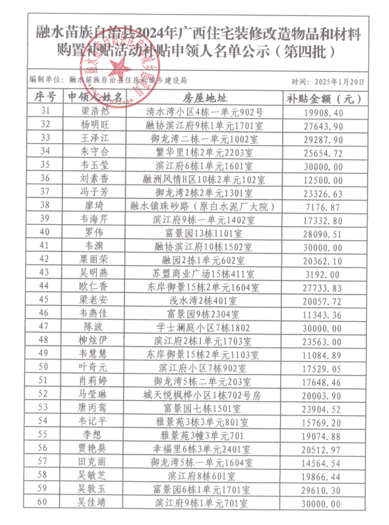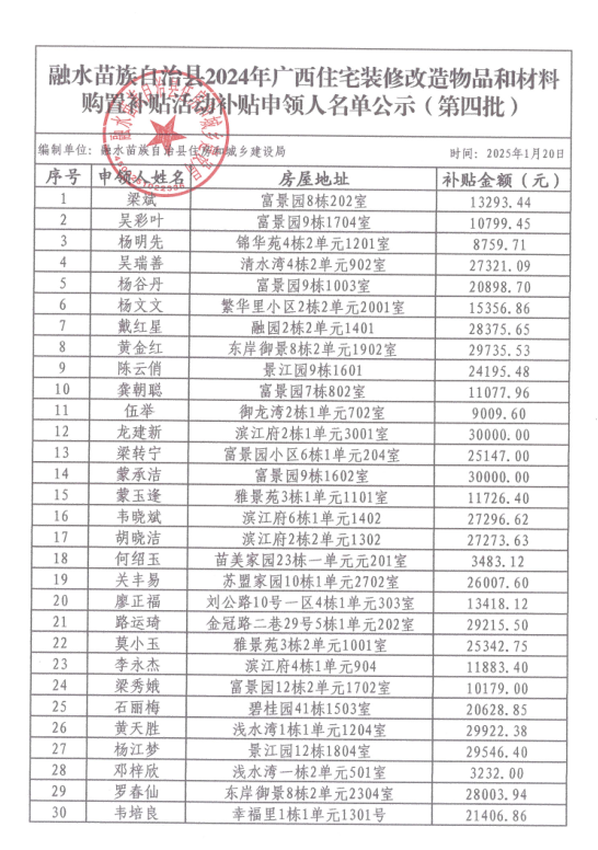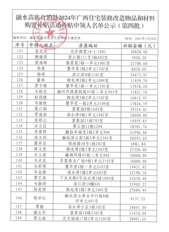 融水苗族自治县2024年广西住宅装修改造物品和材料购置补贴活动补贴申领人名单公示(第四批)