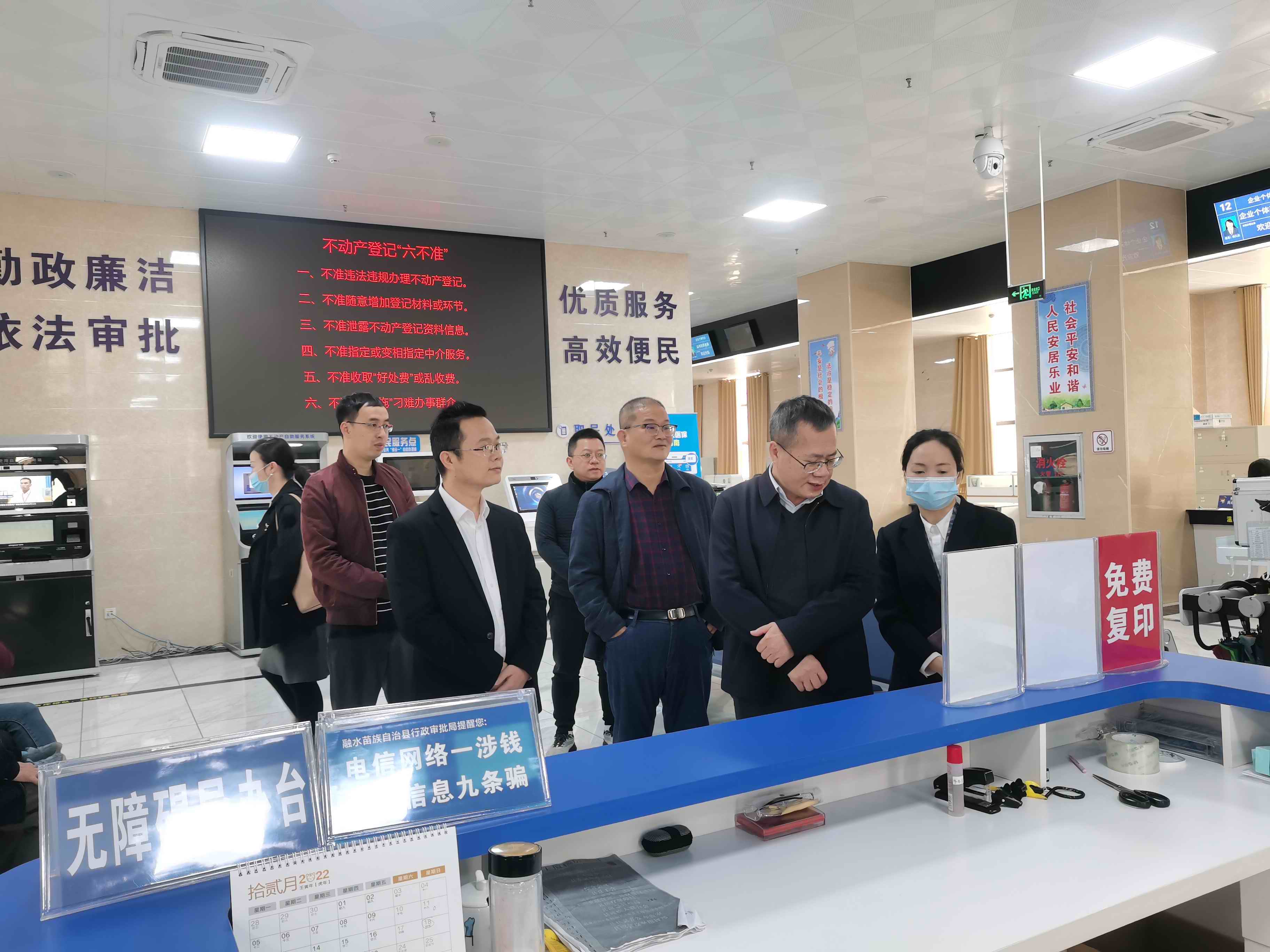 调研组上午到融水县不动产登记中心服务窗口考察,以群众身份体验无障碍通道及办理不动产登记流程,走访服务窗口,了解自助设备的使用情况。吴锡熹巡视员对中心为提升不动产登记工作质量和服务水平落实的便民措施给予了肯定。