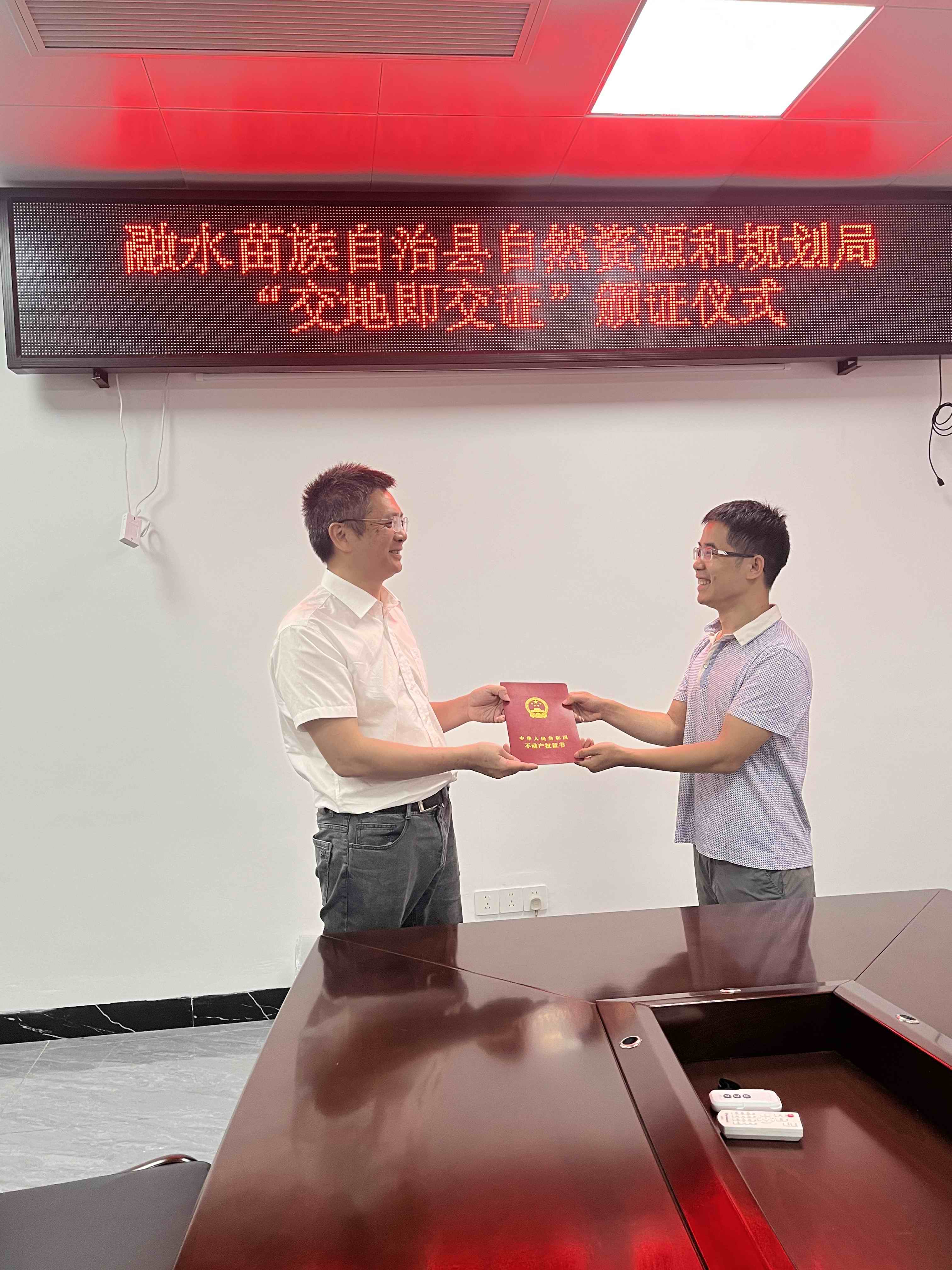 9月24日融水苗族自治县自然资源和规划局为广西电网有限责任公司柳州供电局在交地当天成功办理并颁发了不动产登记证书。