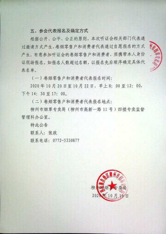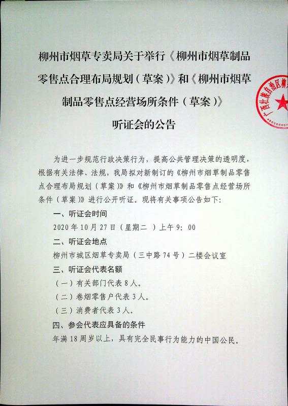 柳州市烟草专卖局关于举行《柳州市烟草制品零售点合理布局规划(草案)》和《柳州市烟草制品零售点经营场所条件(草案)》听证会的公告