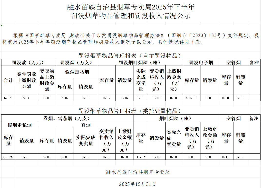 融水苗族自治县烟草专卖局2025年下半年罚没烟草物品管理和罚没收入情况公示