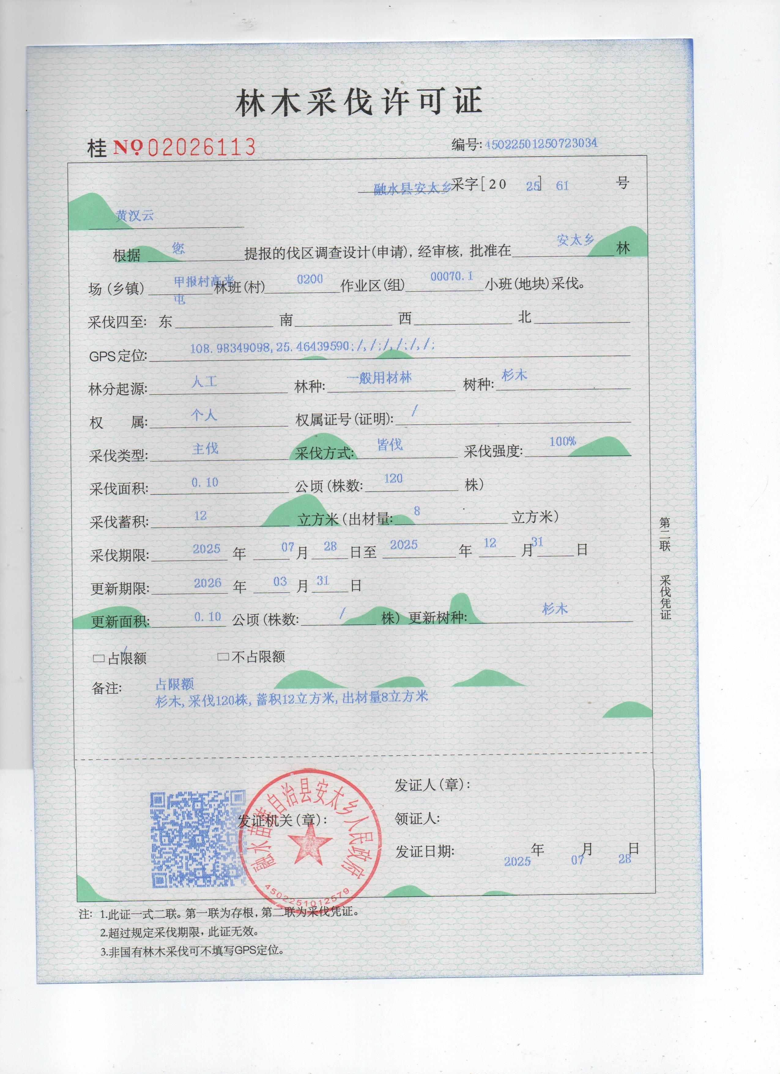 林木采伐许可证:黄汉云(桂NO.02026113) 公示