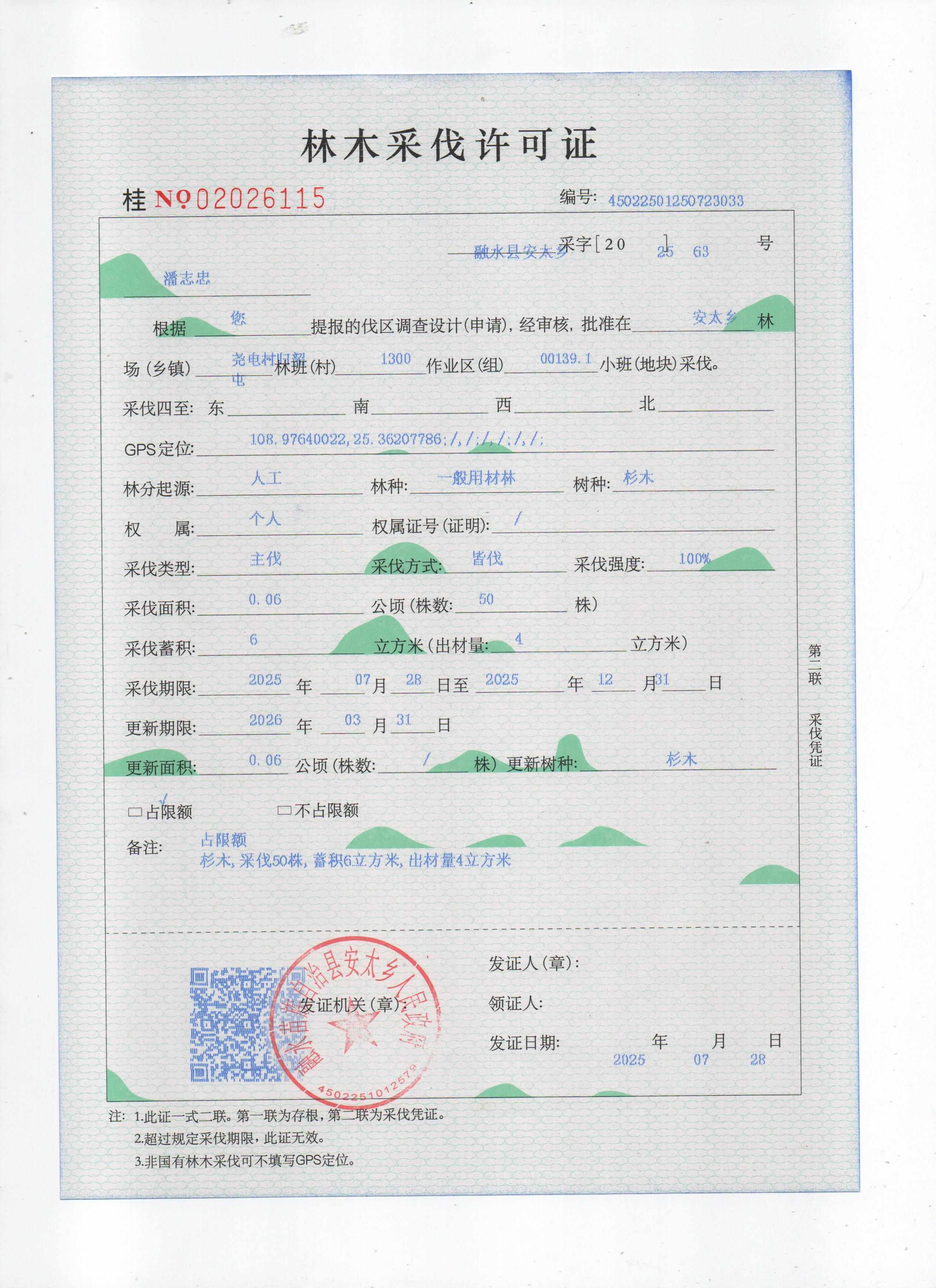 林木采伐许可证:潘志忠(桂NO.02026115) 公示