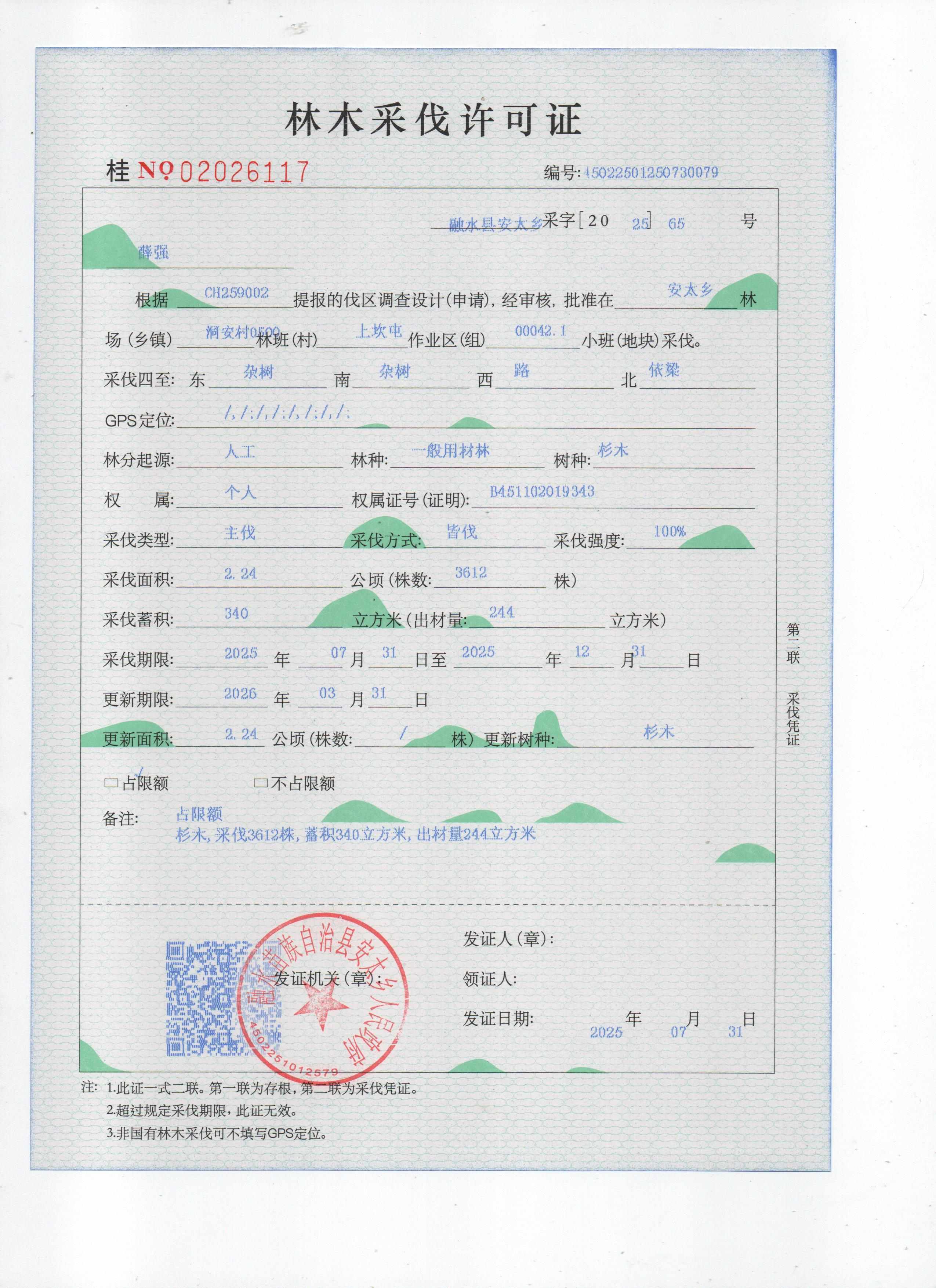 林木采伐许可证:薛强(桂NO.02026117) 公示