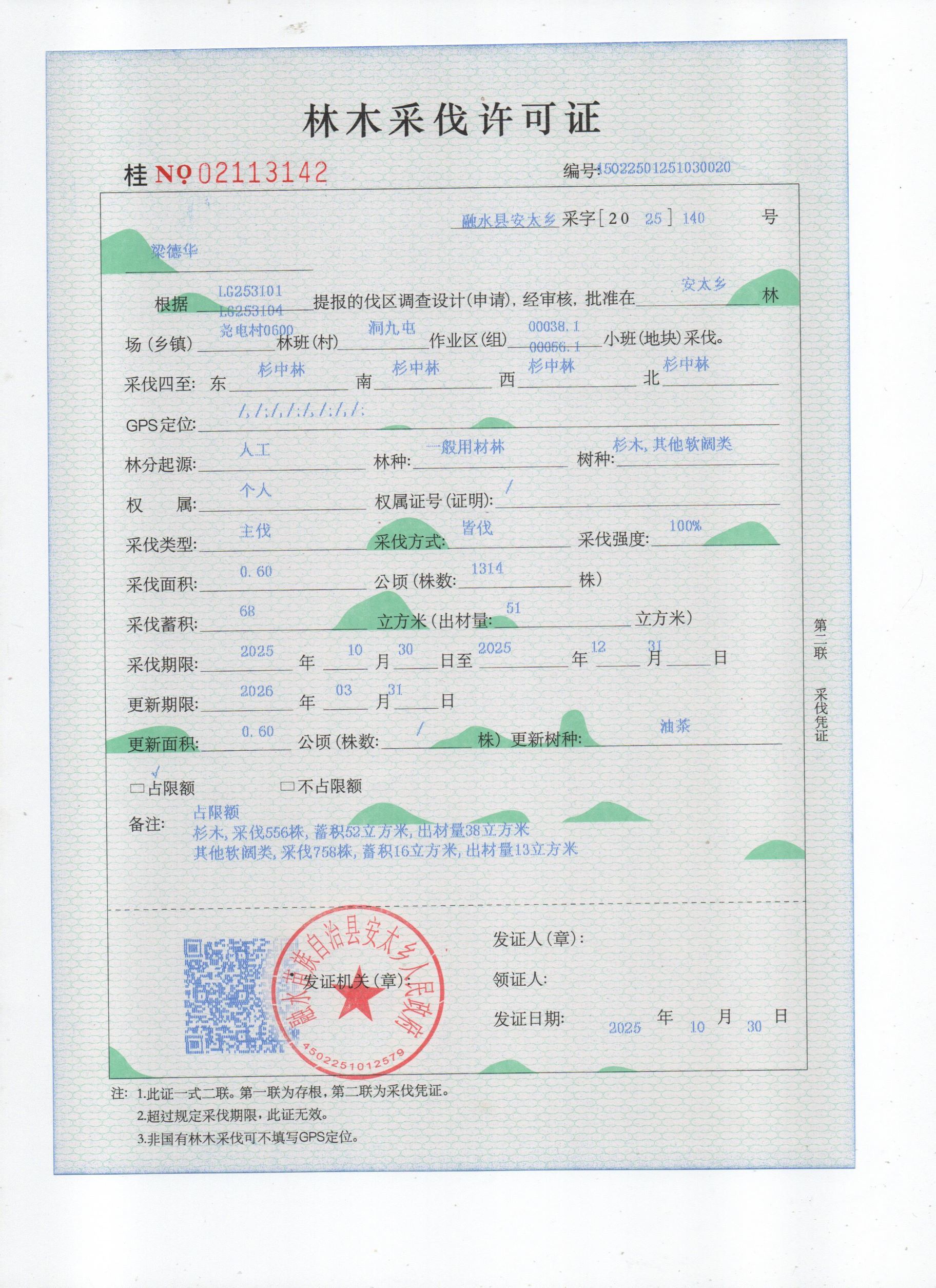 林木采伐许可证:梁德华(桂NO.02113142)公示