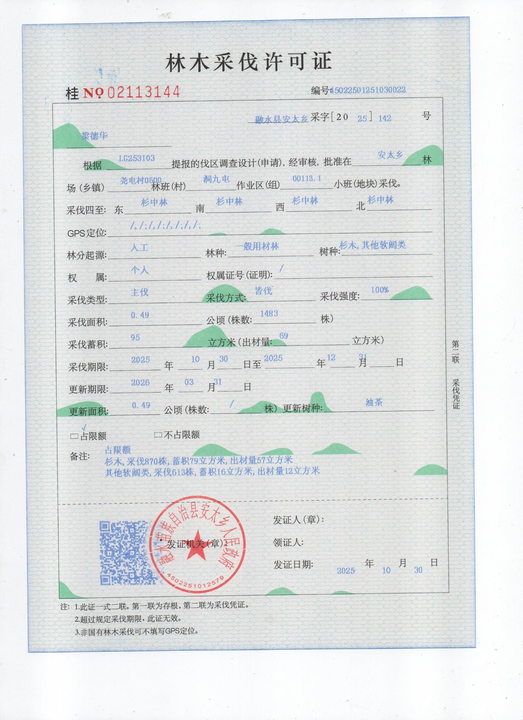 林木采伐许可证:梁德华(桂NO.02113144)公示
