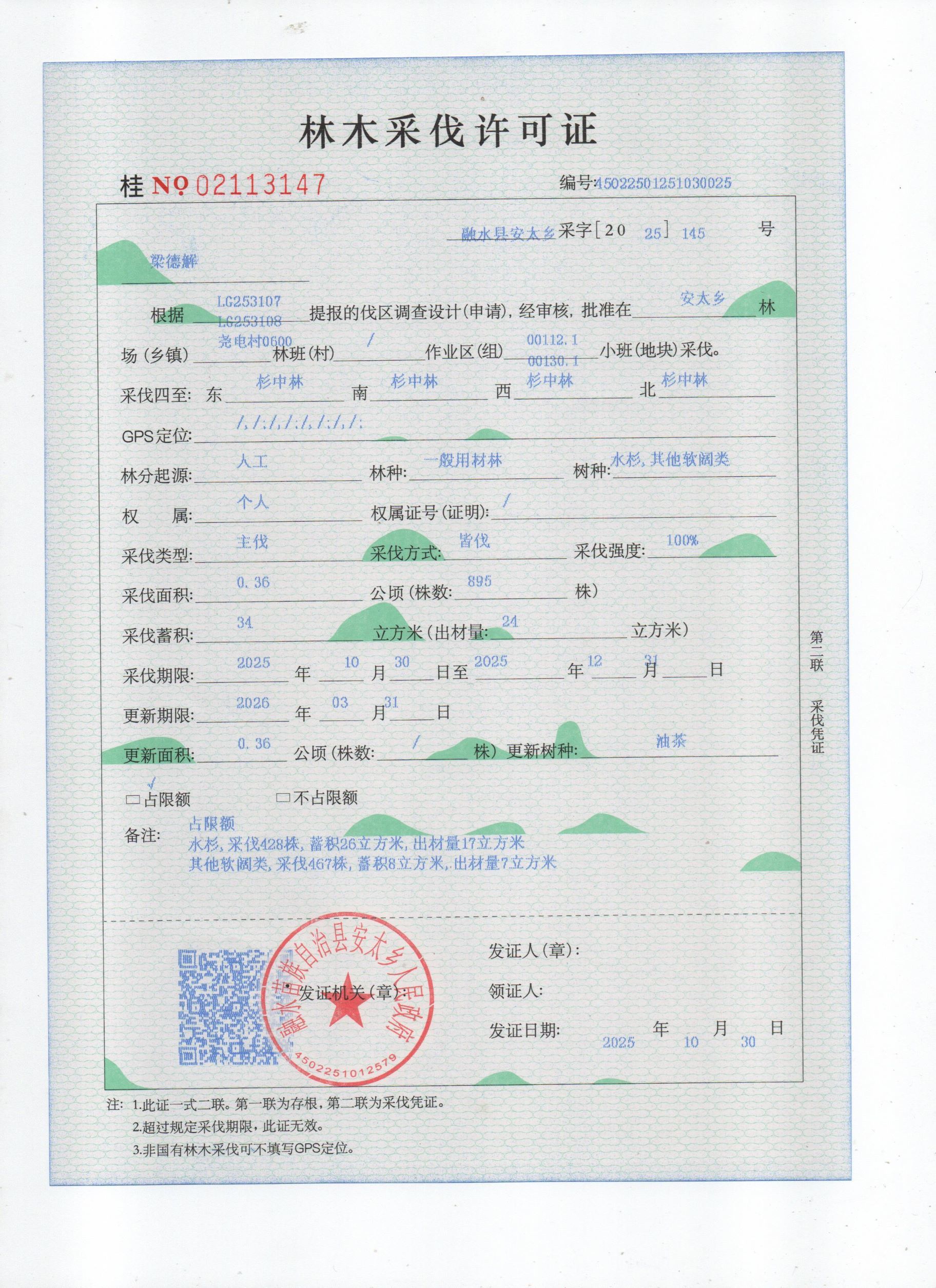 林木采伐许可证:梁德解(桂NO.02113147)公示