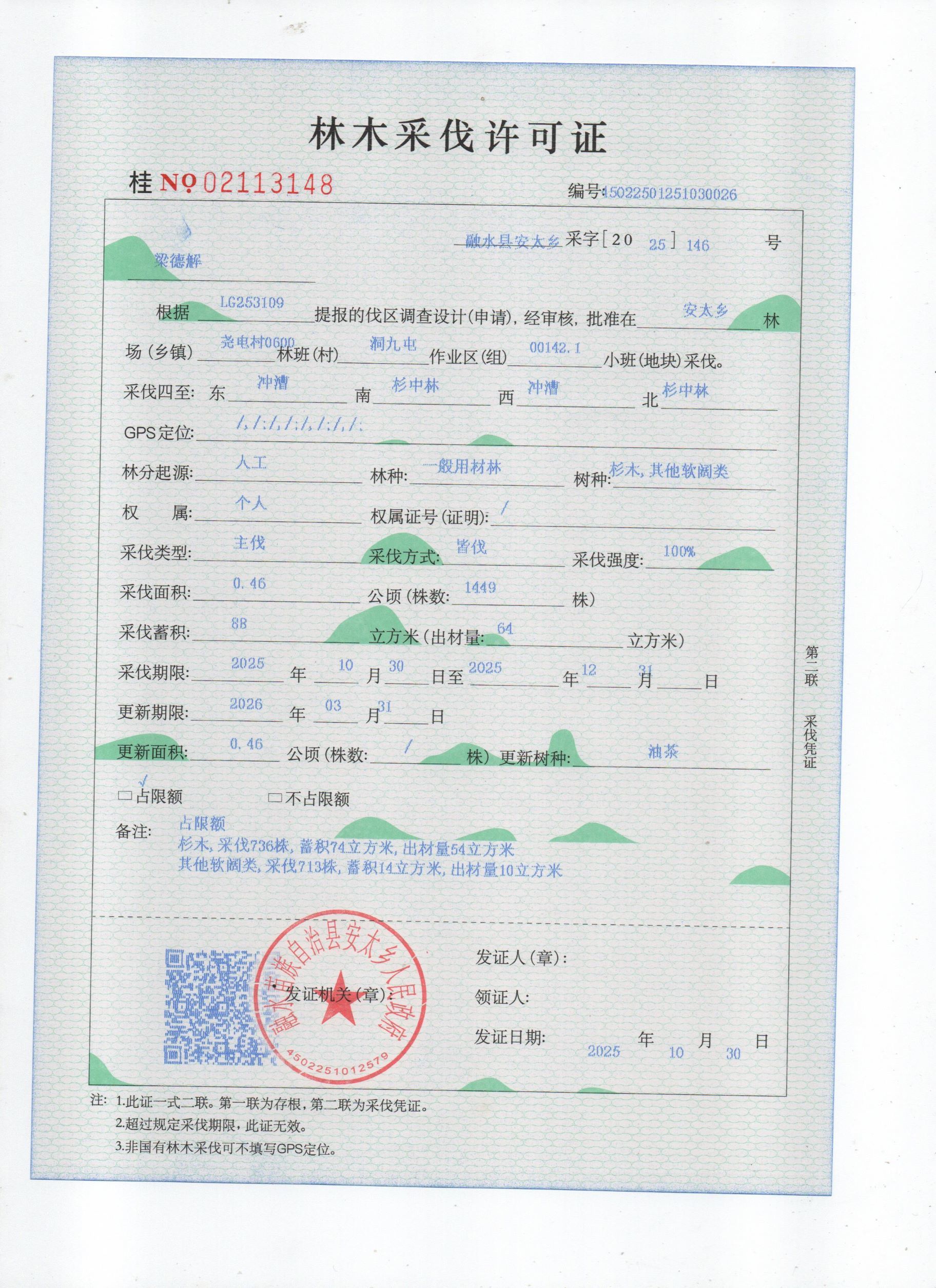 林木采伐许可证:梁德解(桂NO.02113148)公示