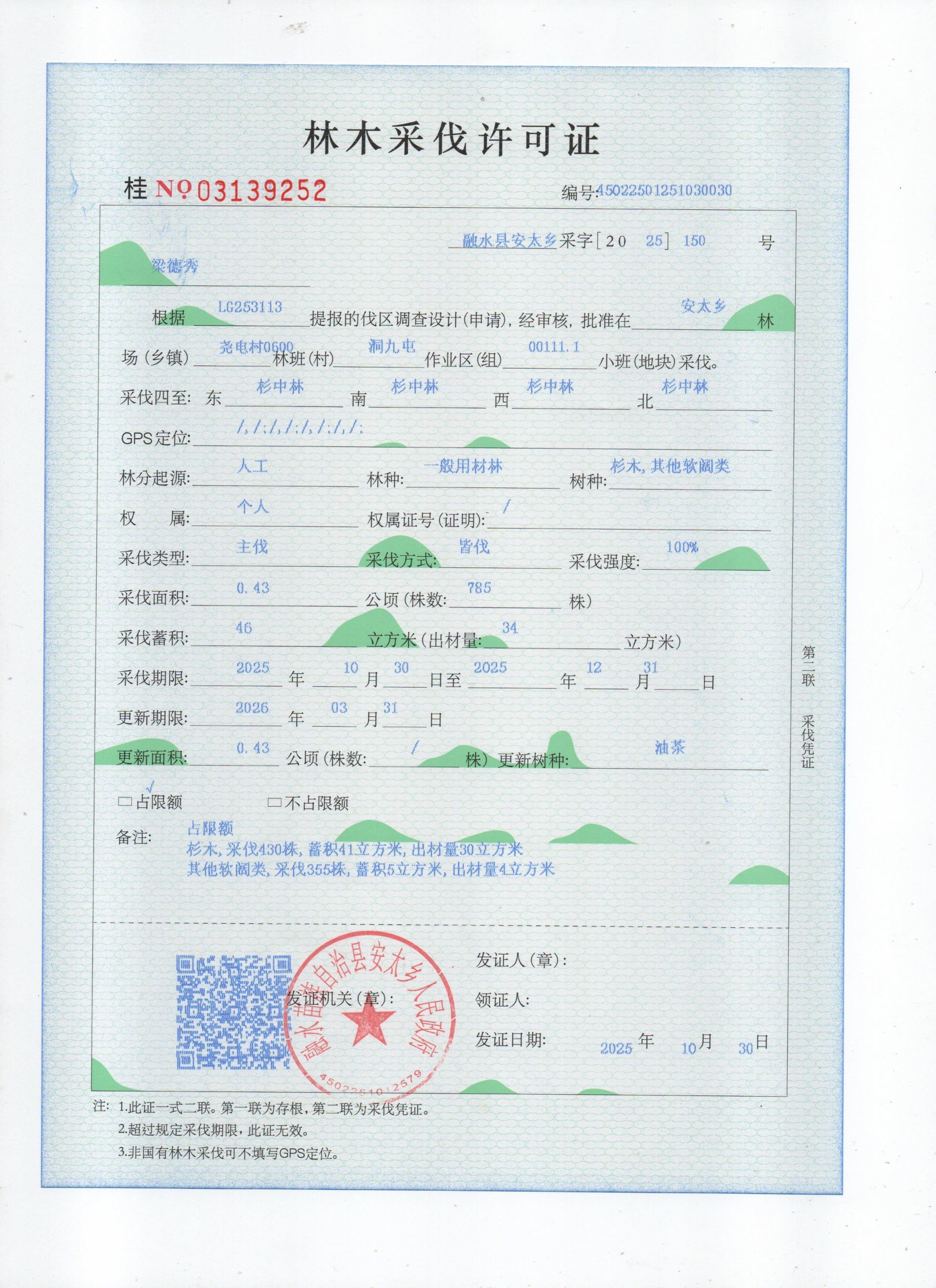林木采伐许可证:梁德秀(桂NO.03139252)公示