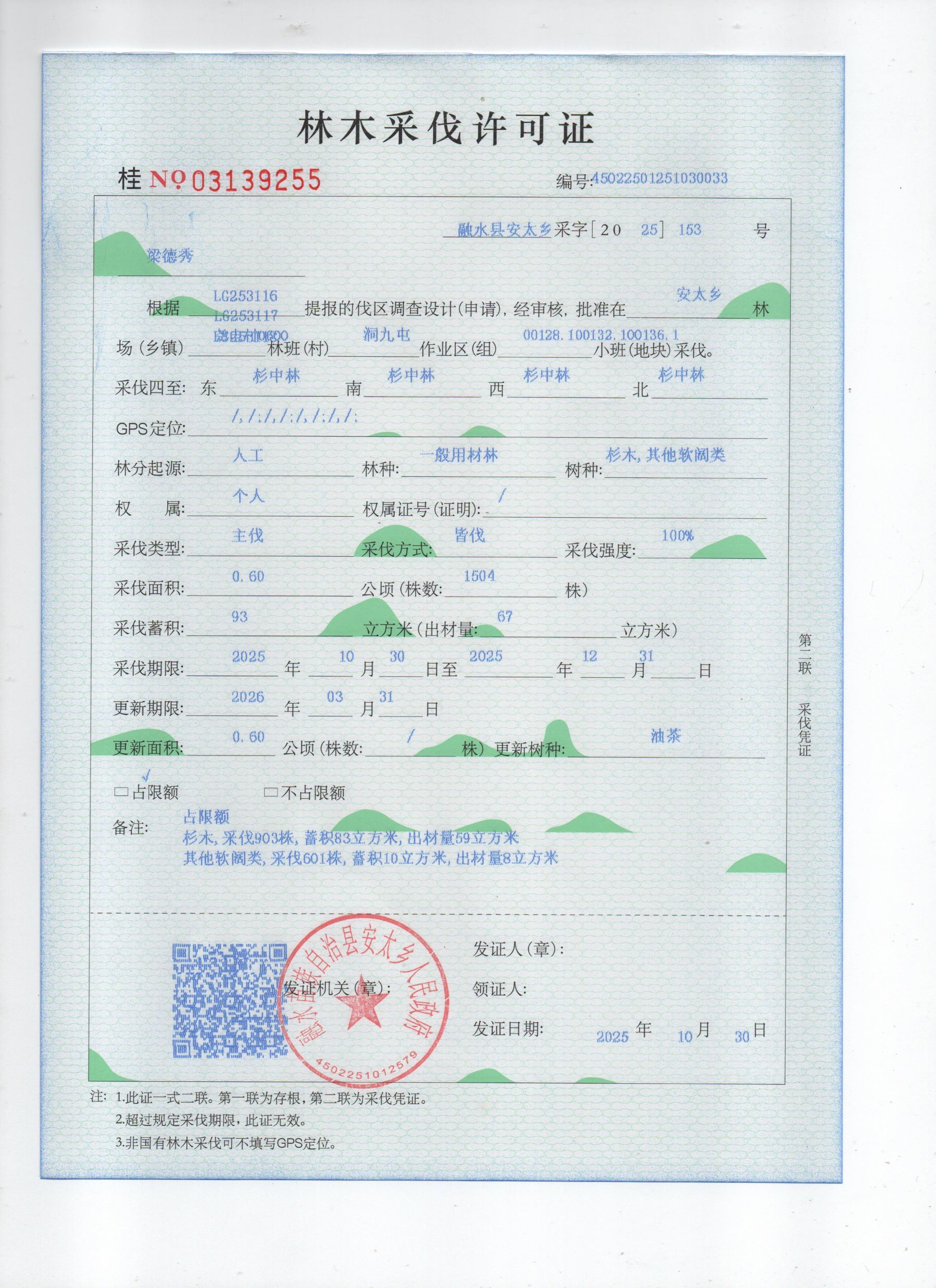 林木采伐许可证:梁德秀(桂NO.03139255)公示
