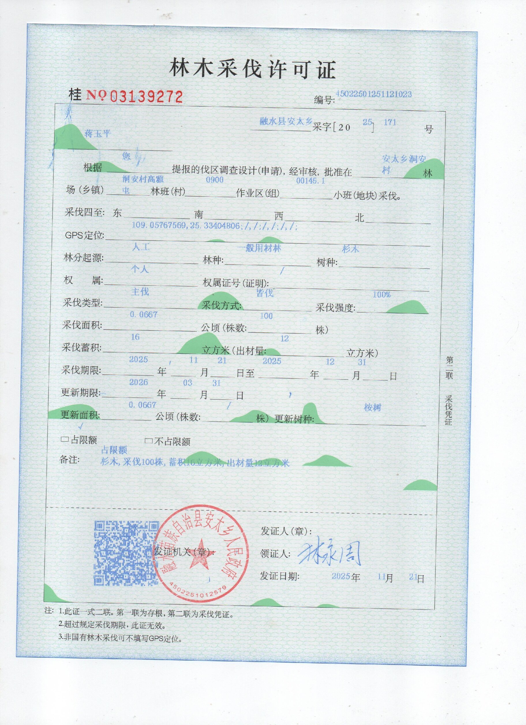 林木采伐许可证:蒋玉平(桂NO.03139272)公示