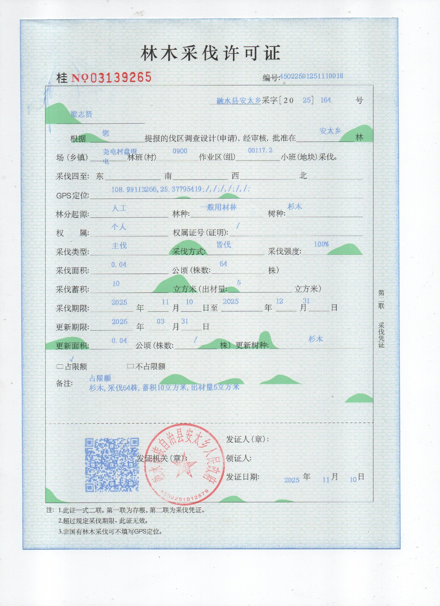 林木采伐许可证:梁志贤(桂NO.03139265)公示