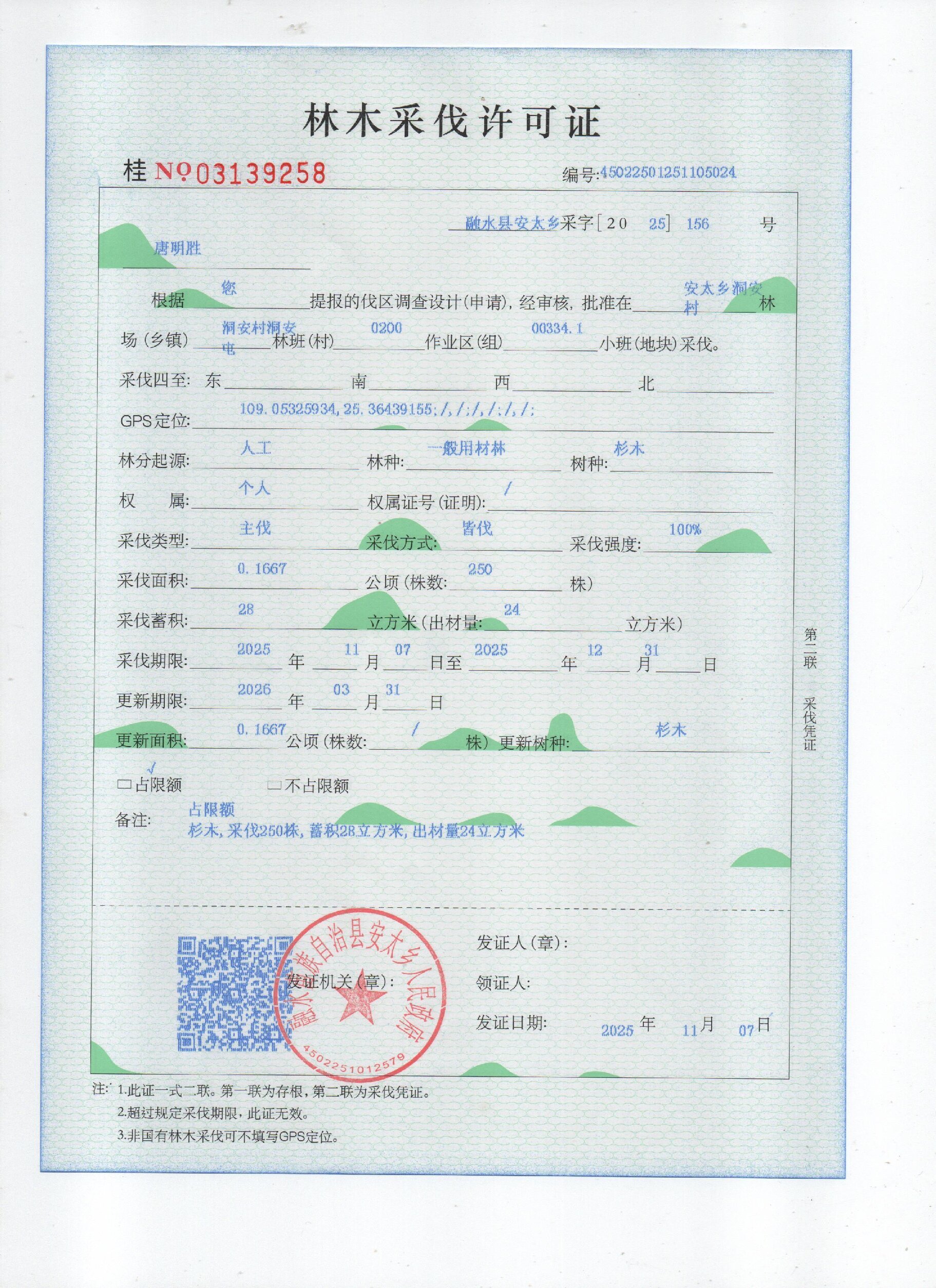 林木采伐许可证:唐明胜(桂NO.03139258)公示