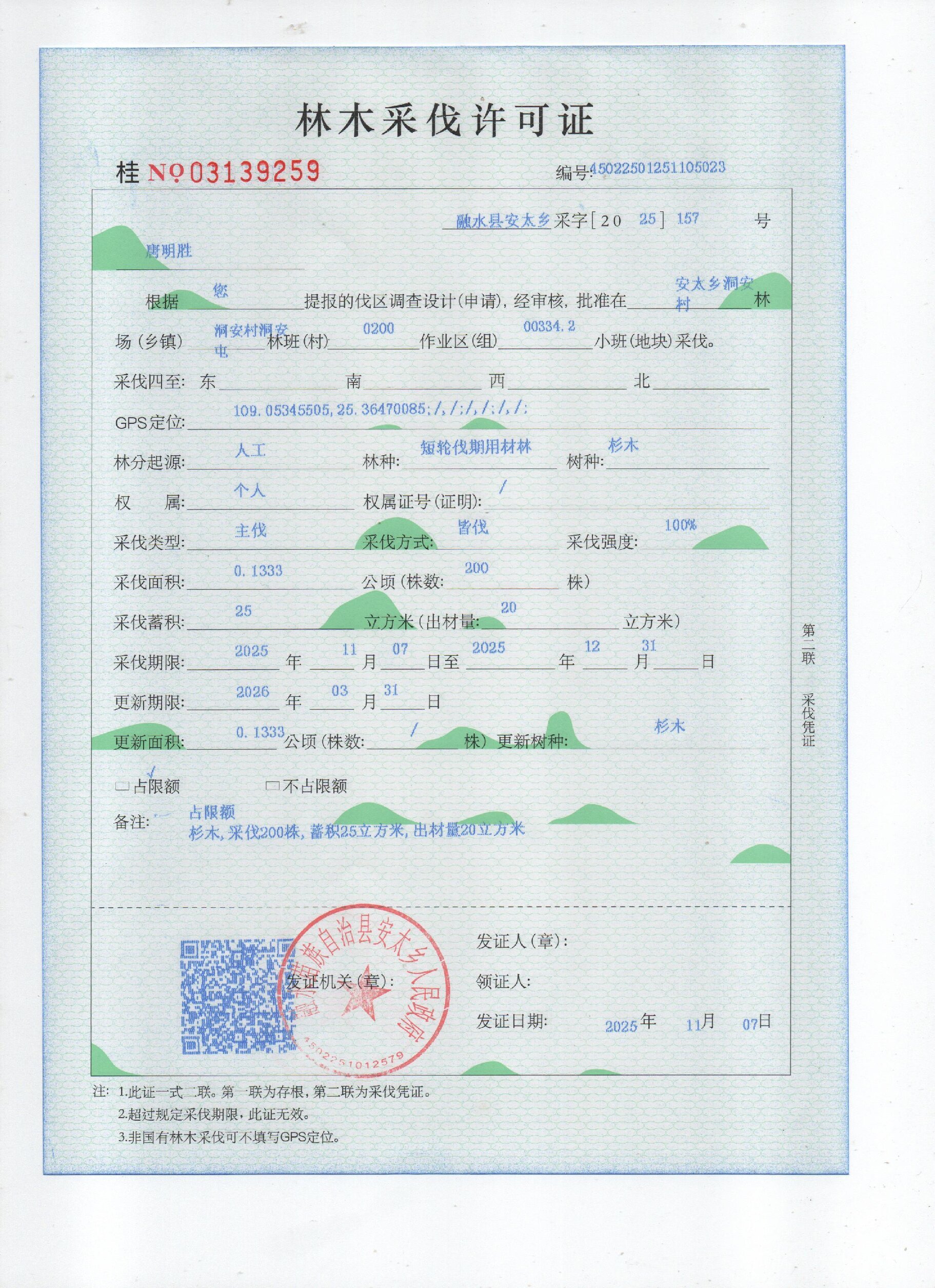 林木采伐许可证:唐明胜(桂NO.03139259)公示