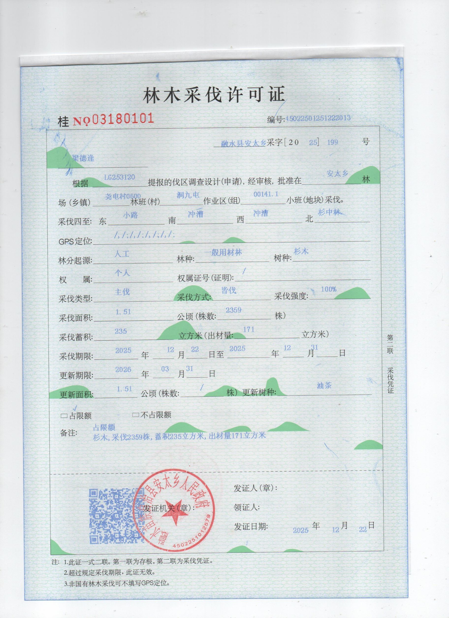 林木采伐许可证:梁德逢(桂NO.03180101)公示