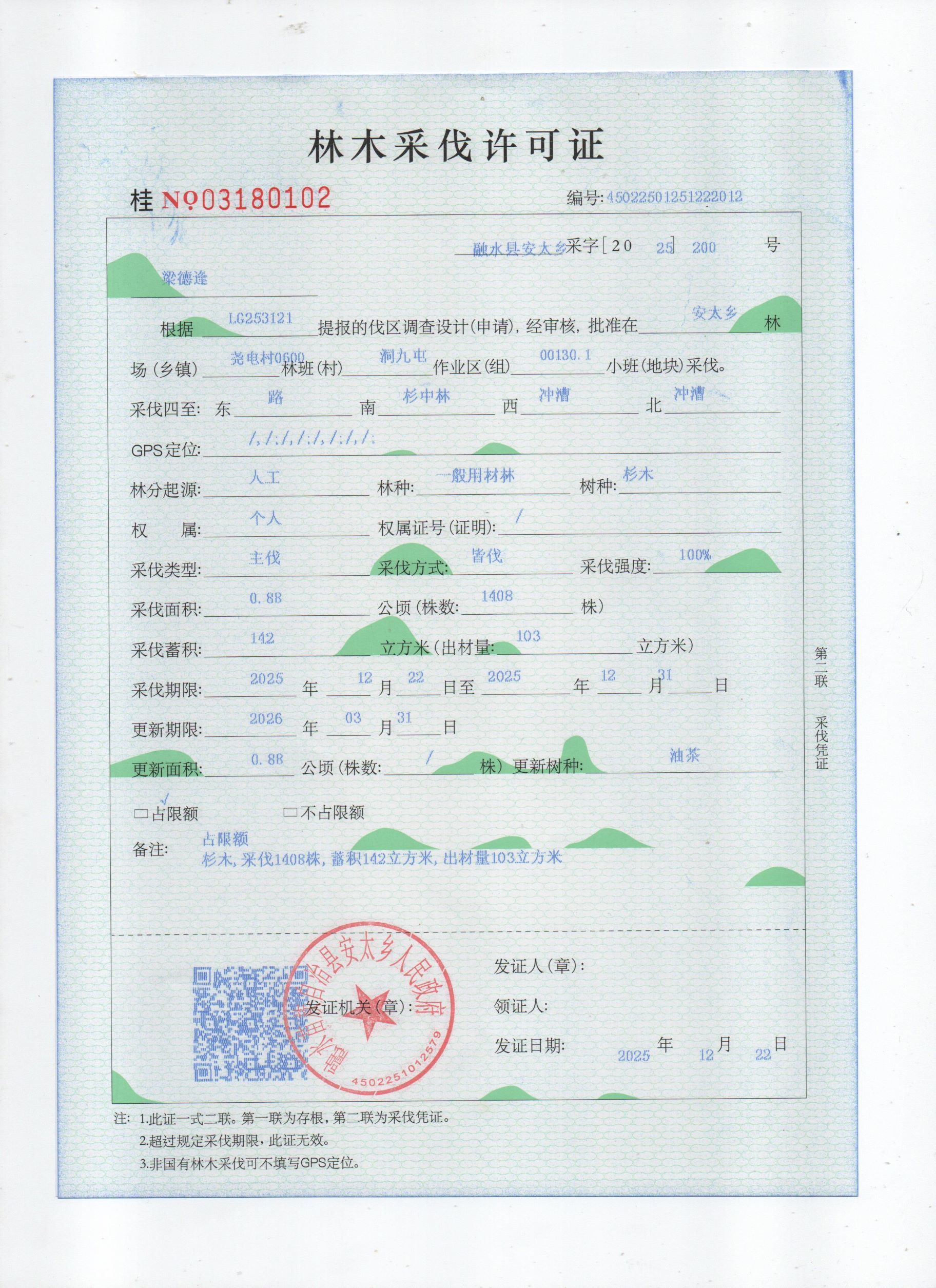 林木采伐许可证:梁德逢(桂NO.03180102)公示