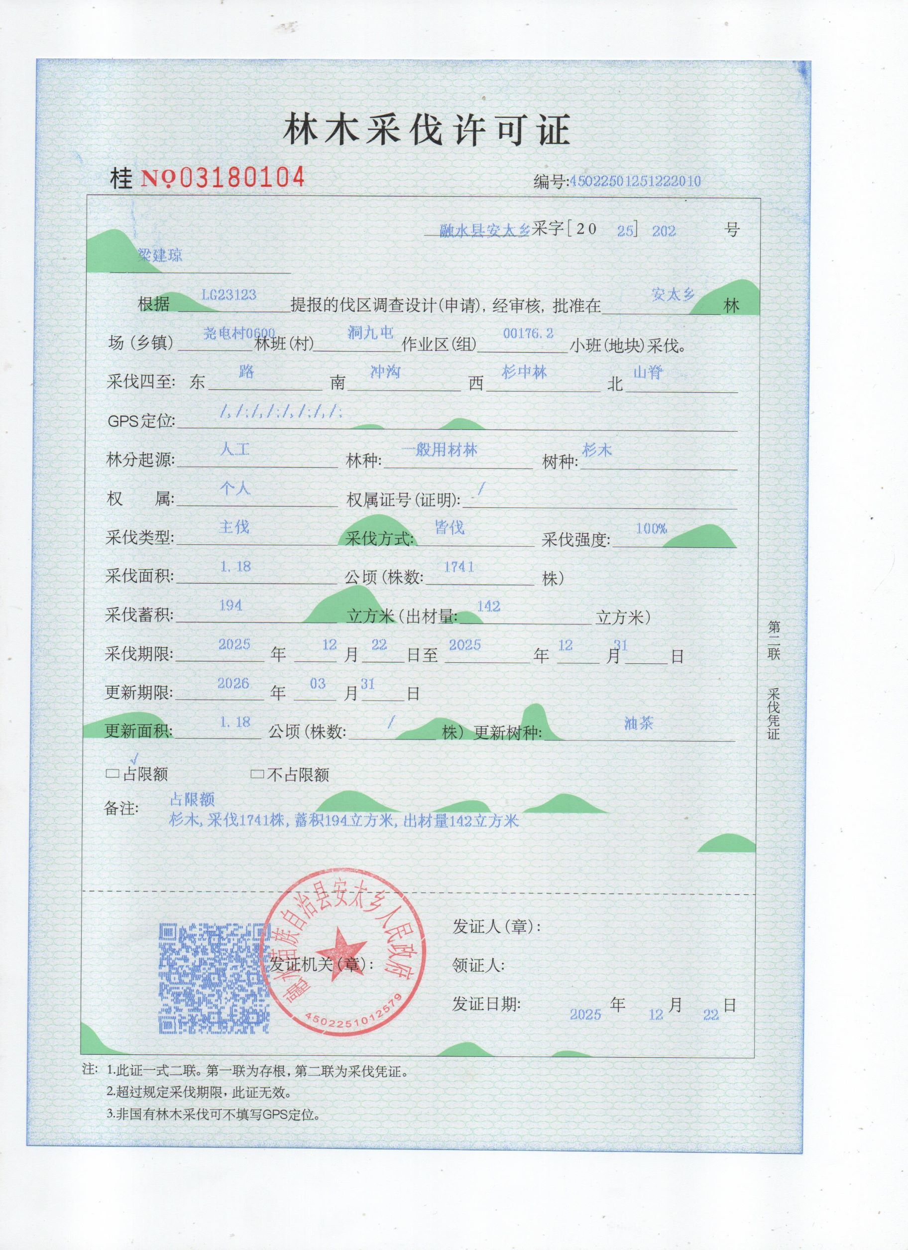 林木采伐许可证:梁建琼(桂NO.03180104)公示