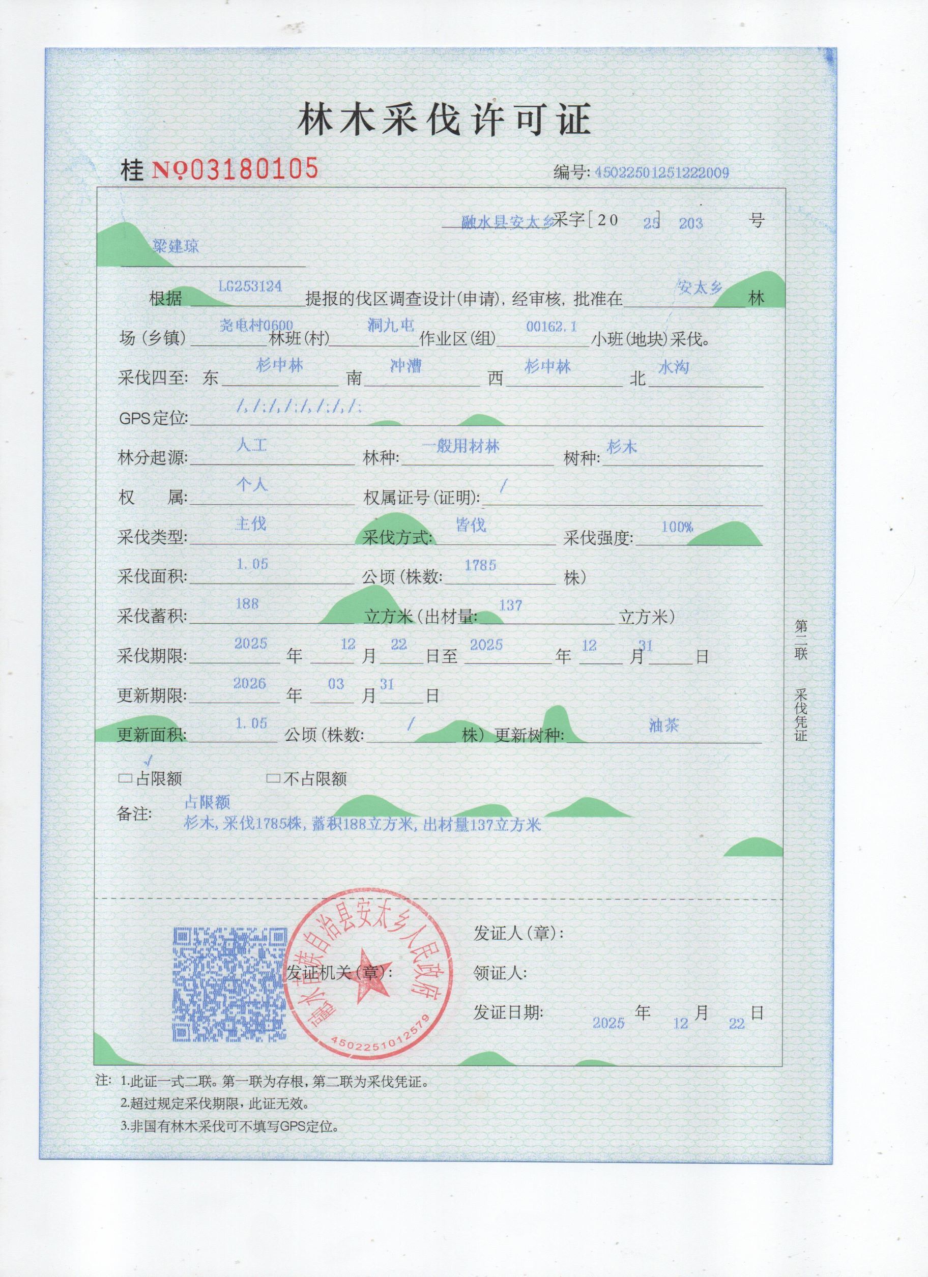 林木采伐许可证:梁建琼(桂NO.03180105)公示