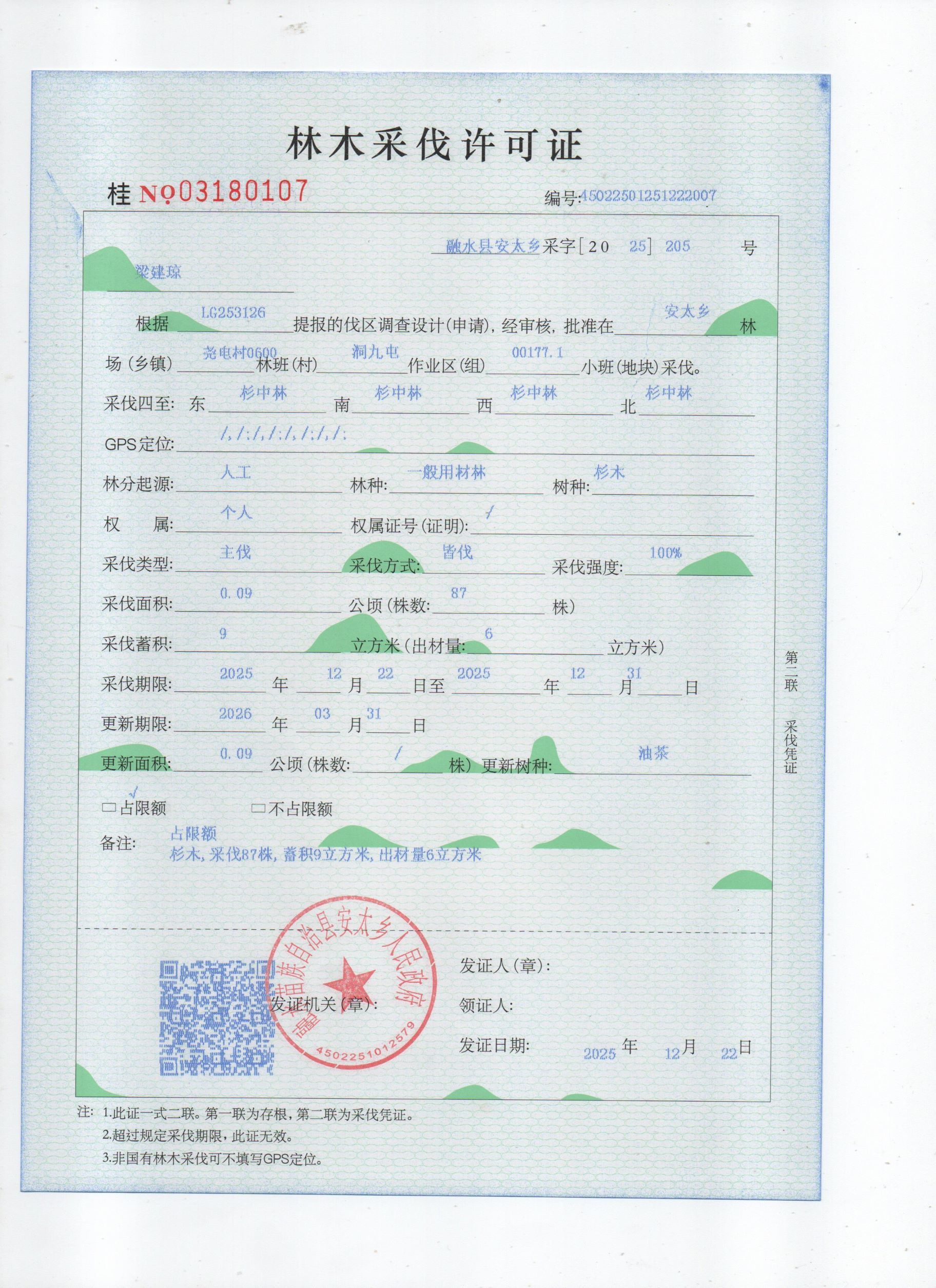 林木采伐许可证:梁建琼(桂NO.03180107)公示