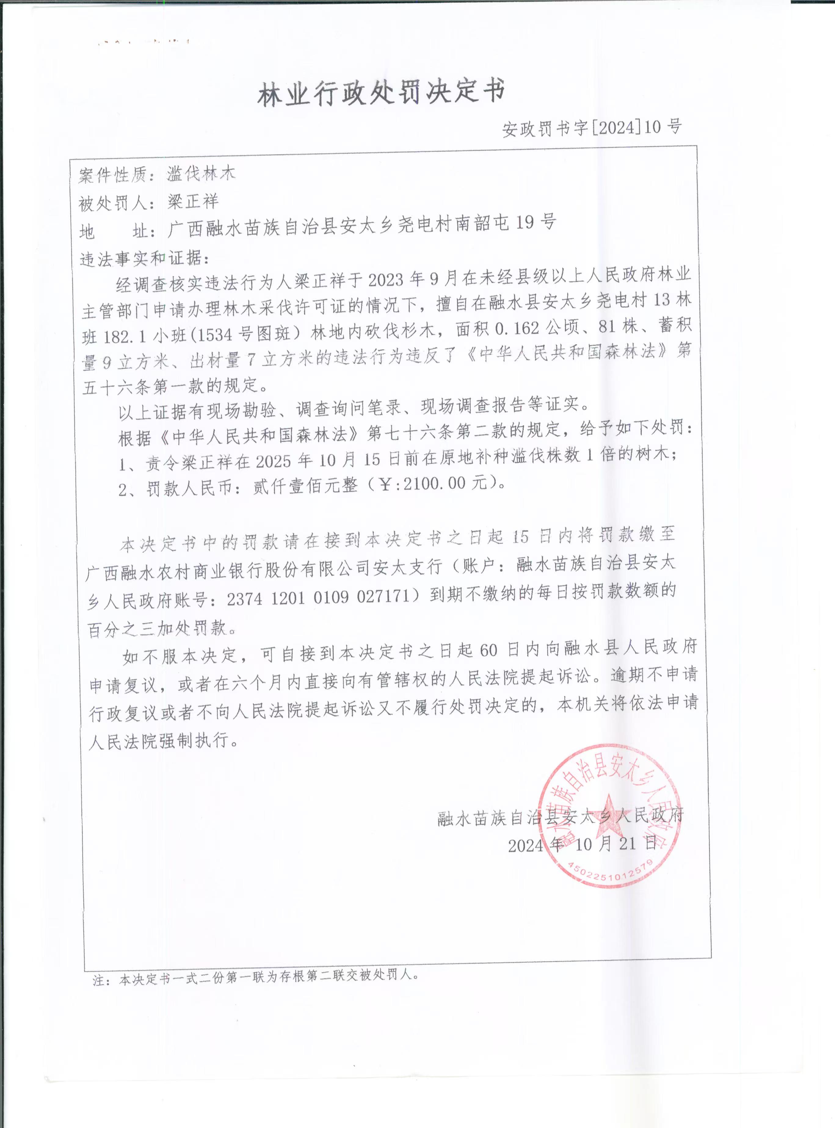 林业行政处罚决定书 :梁正祥(安政罚书字[2024]10号)