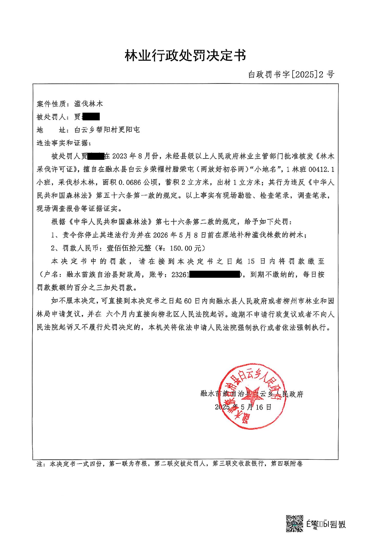 林业行政处罚决定书 白政罚书字[2025]2号