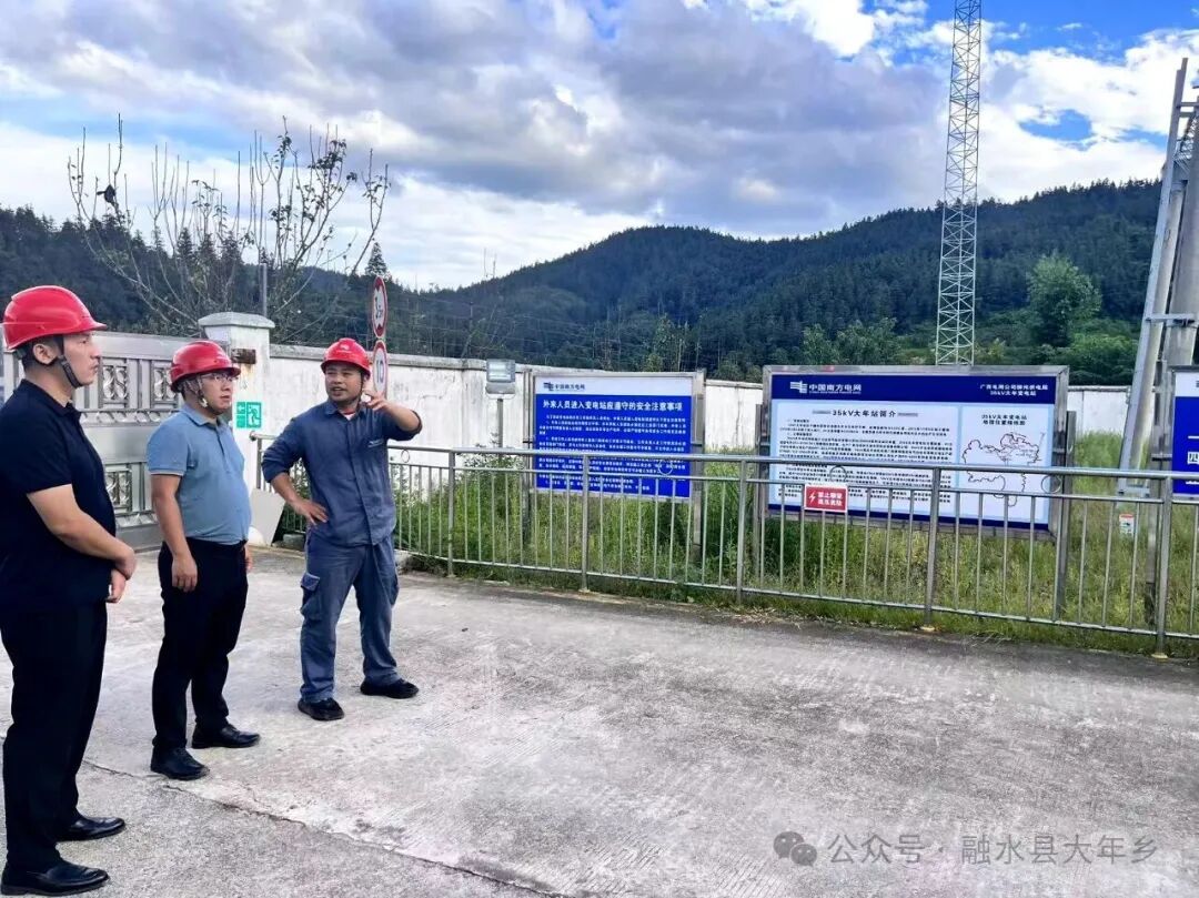 ▲大年乡党委书记韦山(左二)与供电所工作人员到现场检查