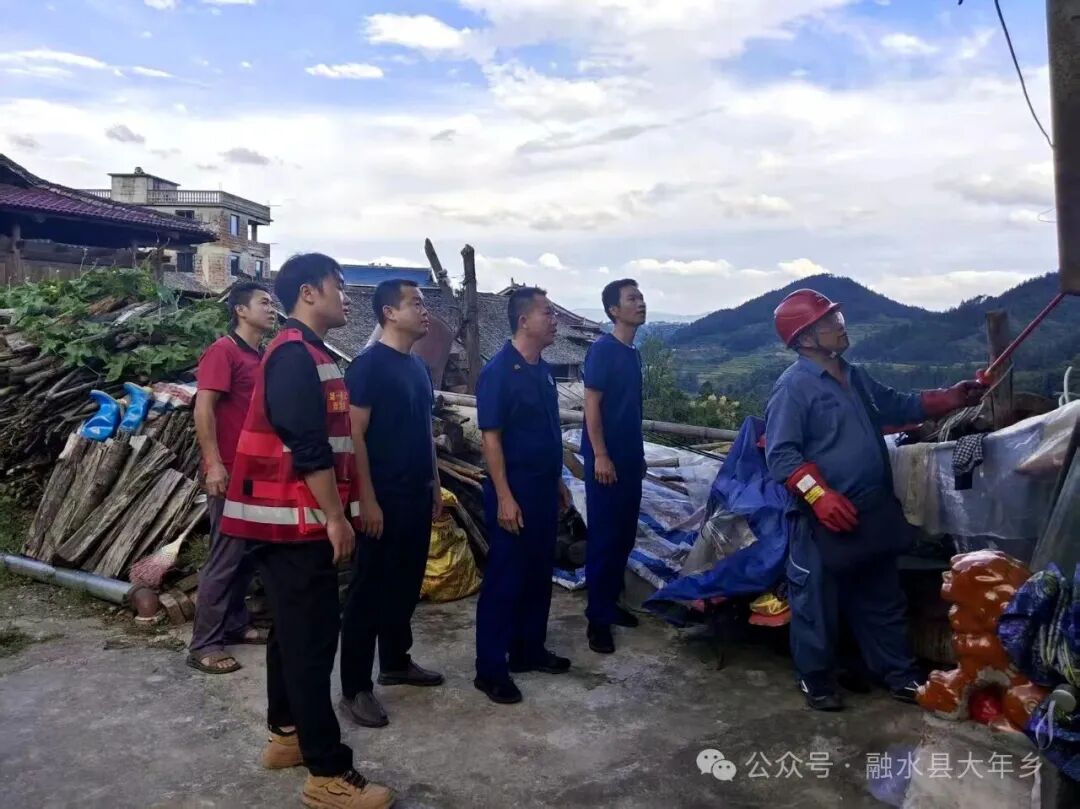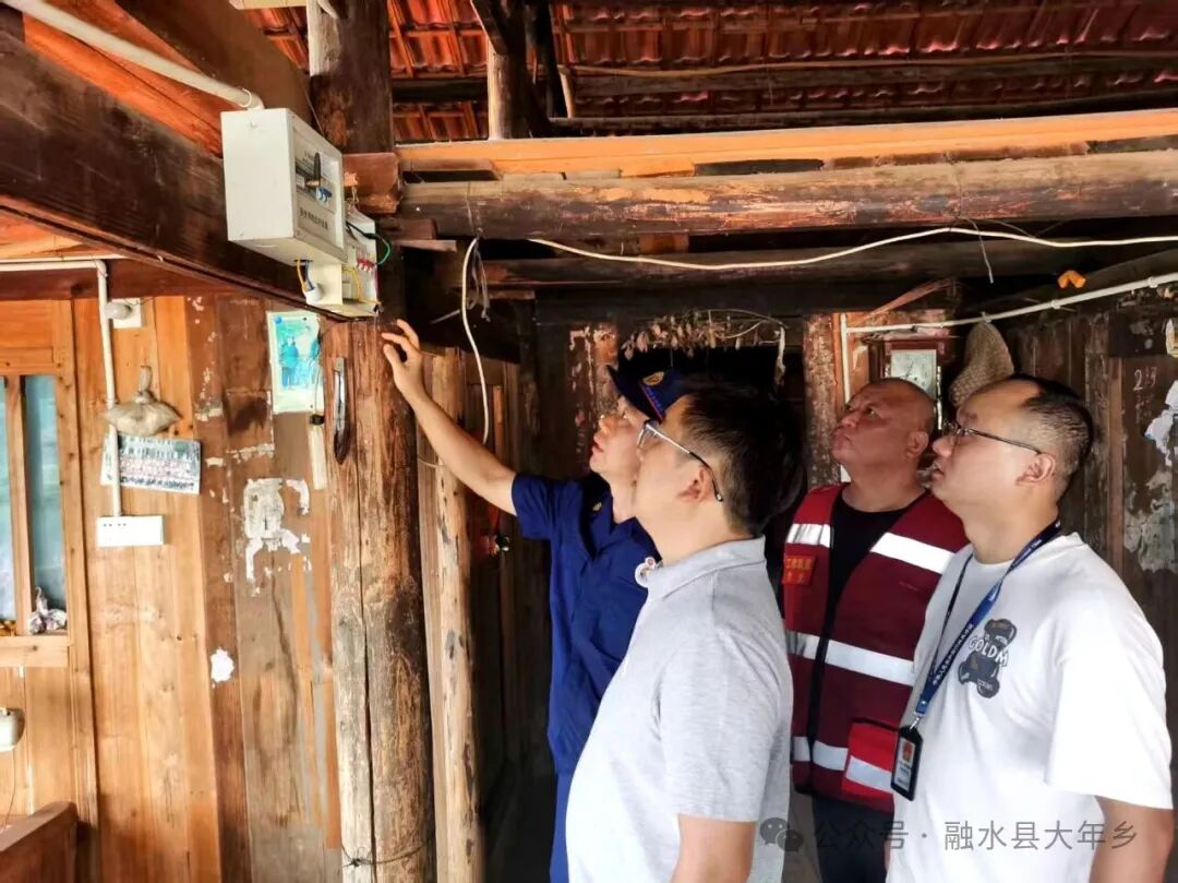 ▲大年乡党委副书记、乡长李阳(左三)到村委现场检查房屋电路
