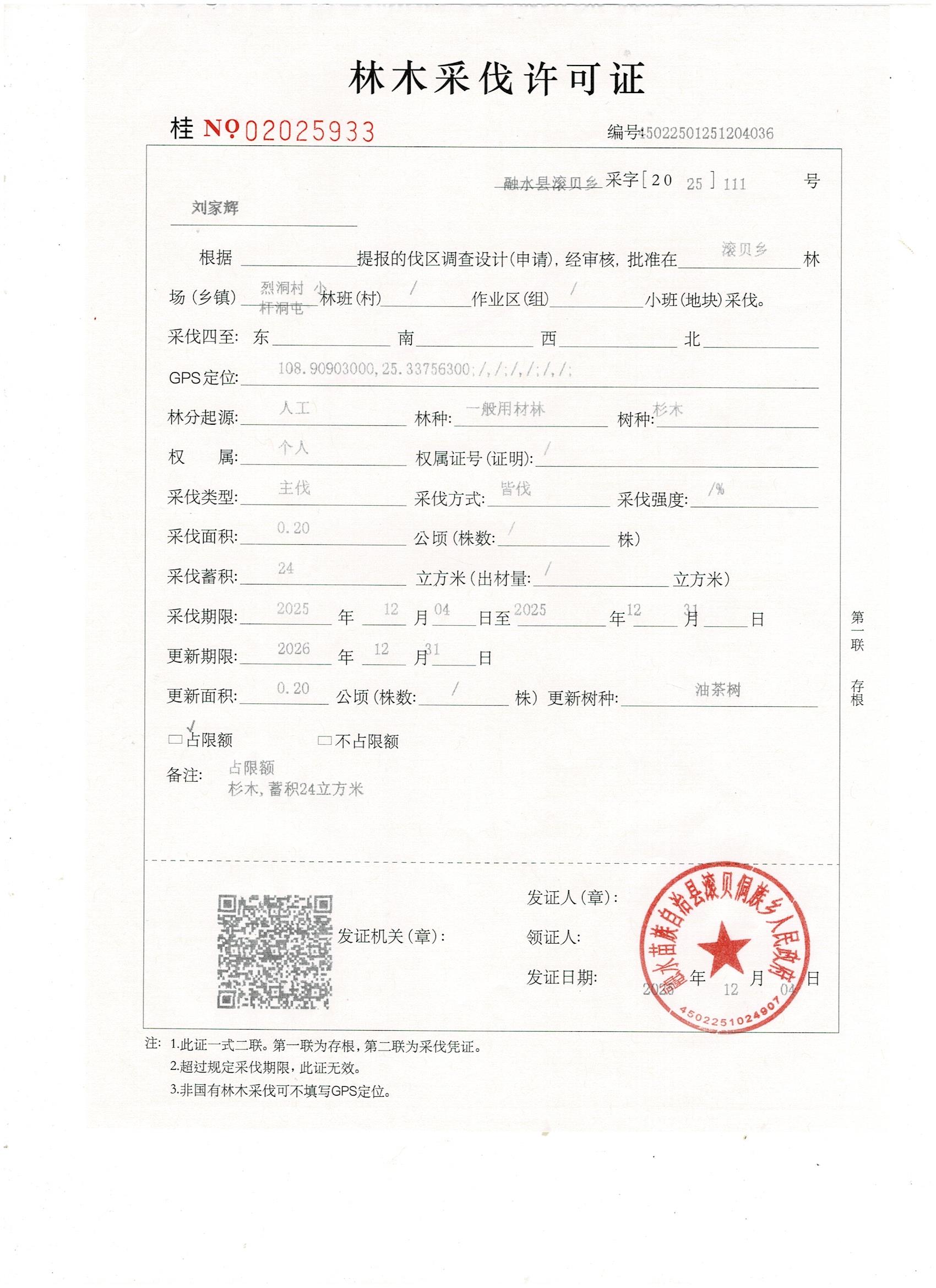 滚贝侗族乡林木采伐许可证20251204刘家辉