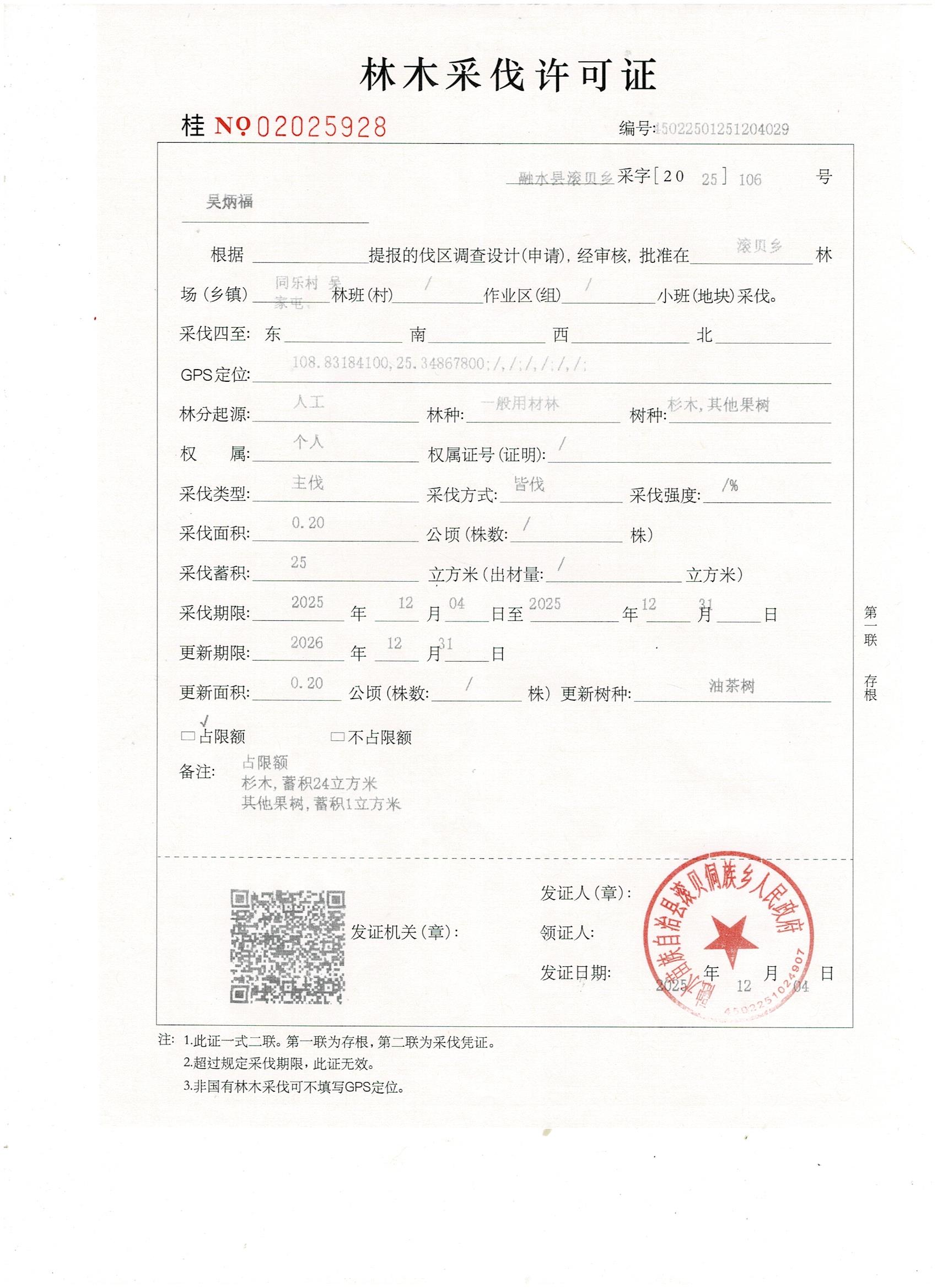 滚贝侗族乡林木采伐许可证20251204吴炳福