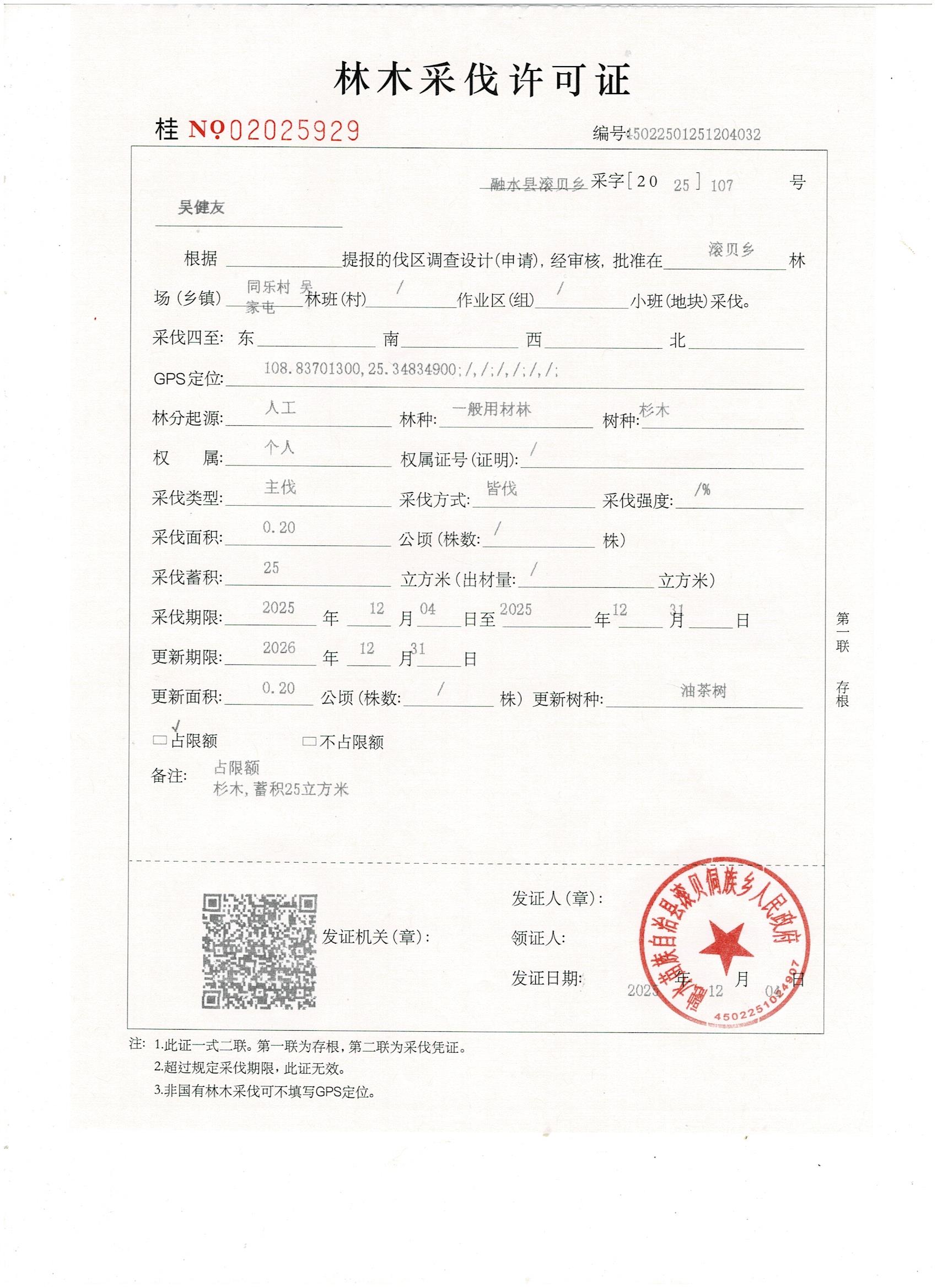 滚贝侗族乡林木采伐许可证20251204吴健友