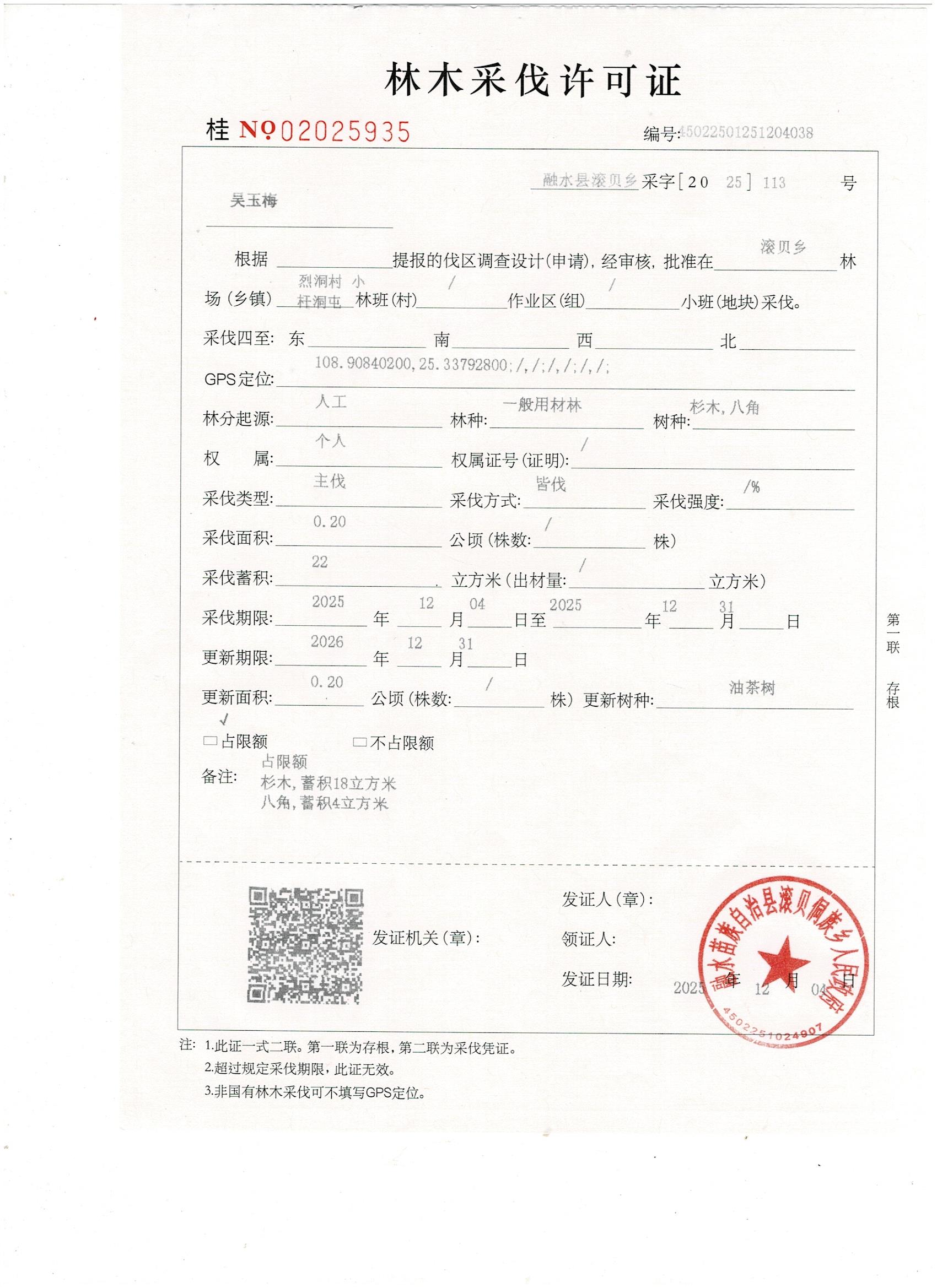 滚贝侗族乡林木采伐许可证20251204吴玉梅